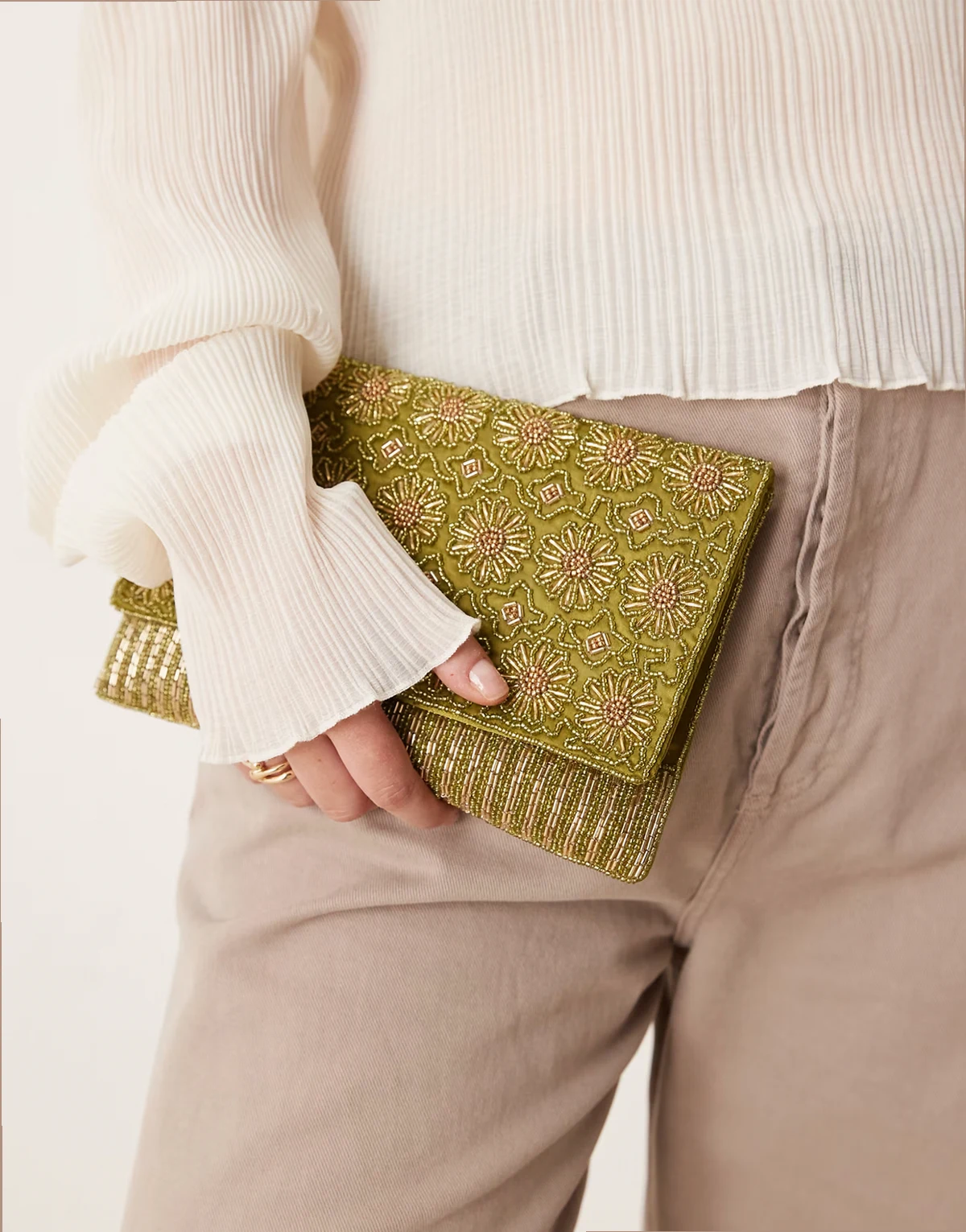 embellished envelope clutch bag in green and gold