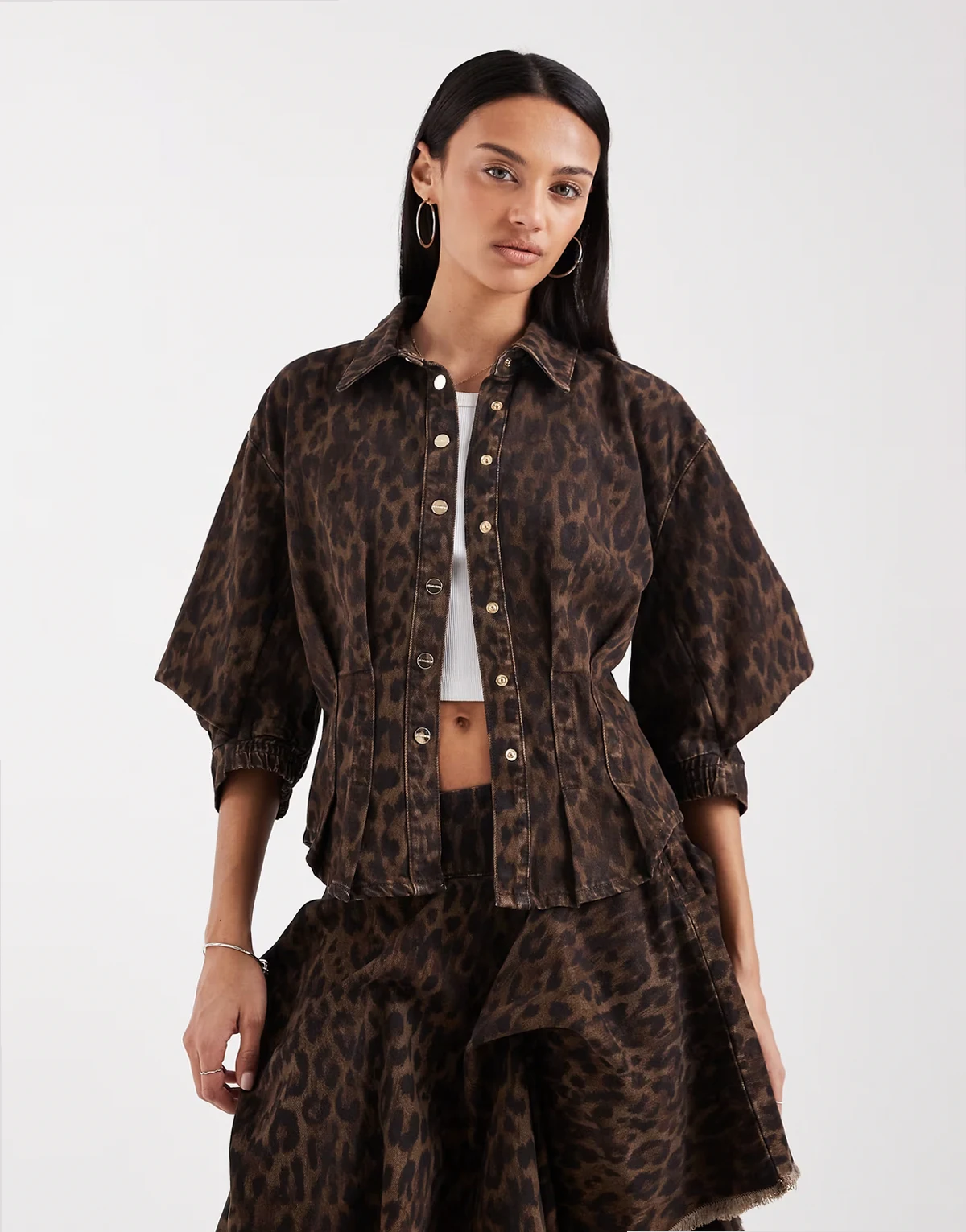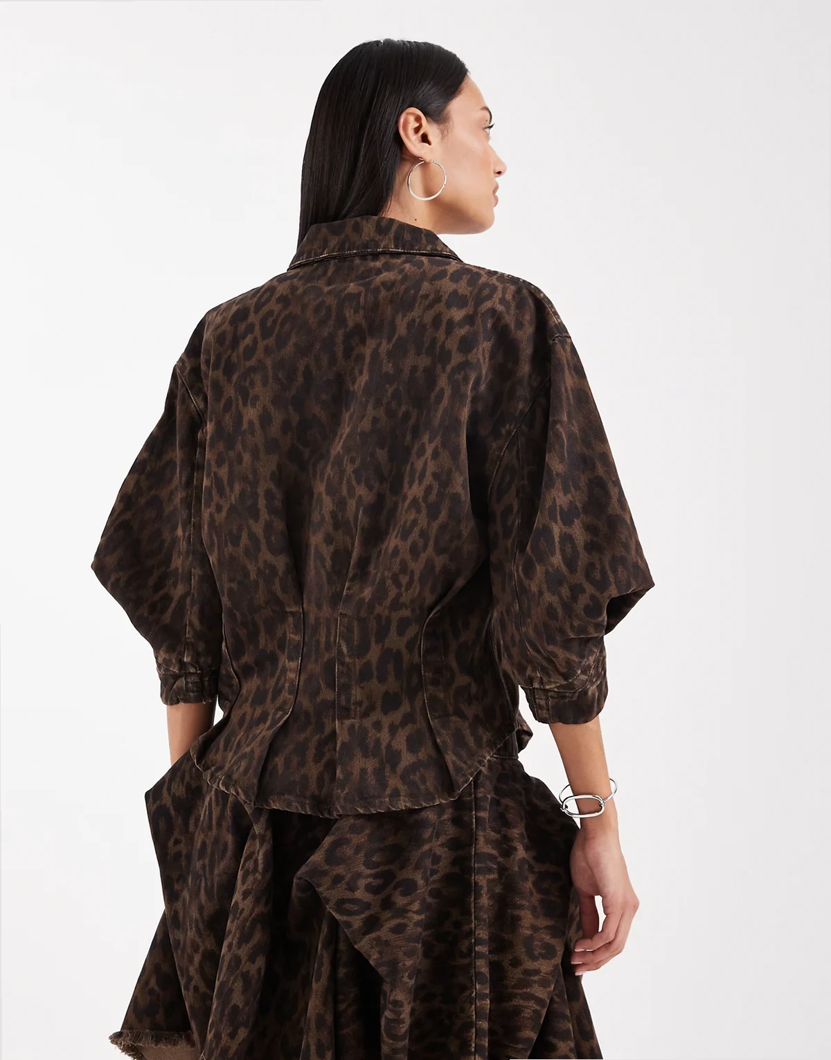 nancy balloon sleeve leopard print denim top in brown