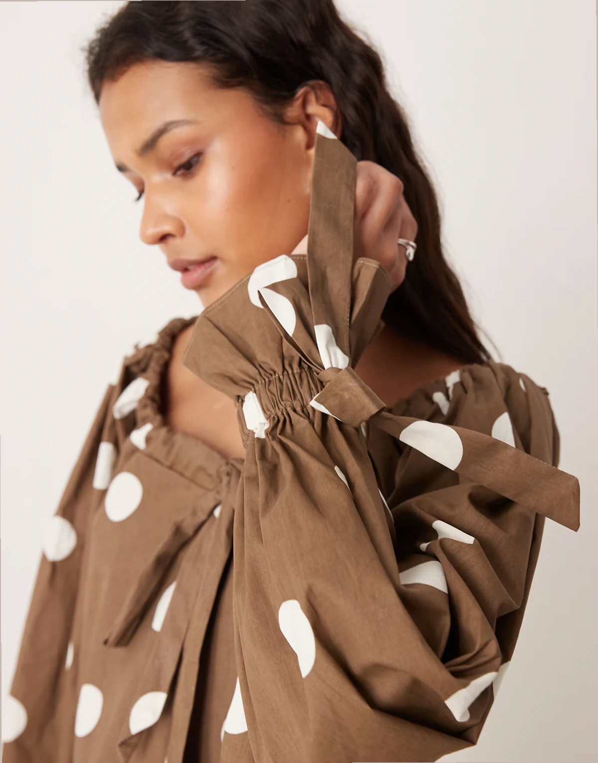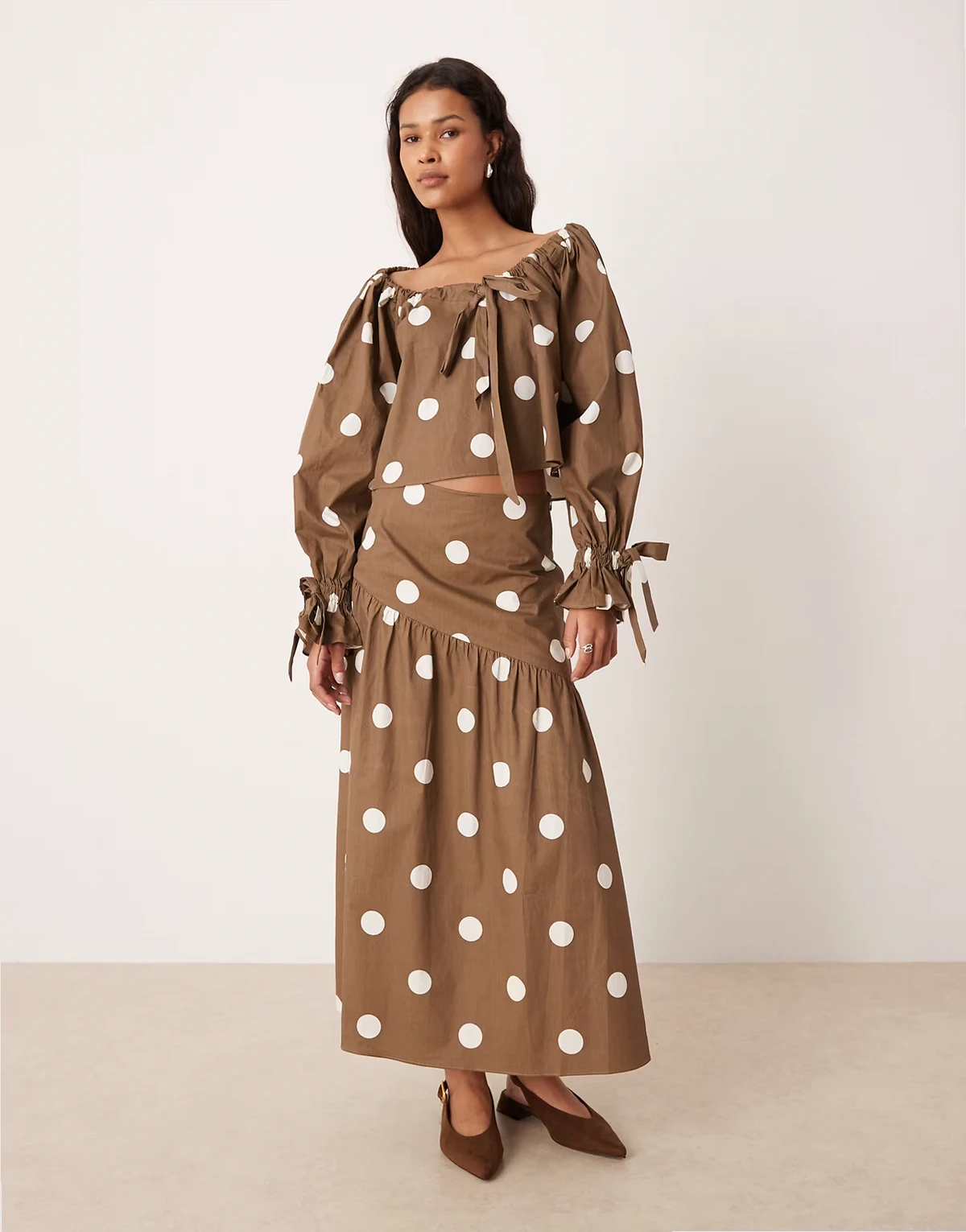 round neck slouchy blouse with ties in brown polka dot - part of a set