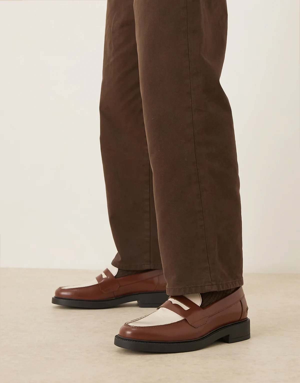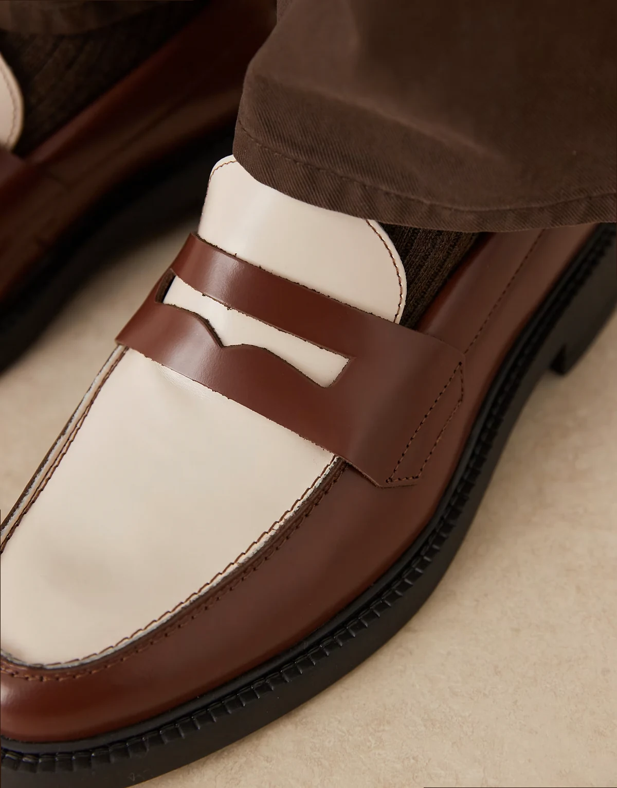 made in Portugal penny loafers in tan and cream leather