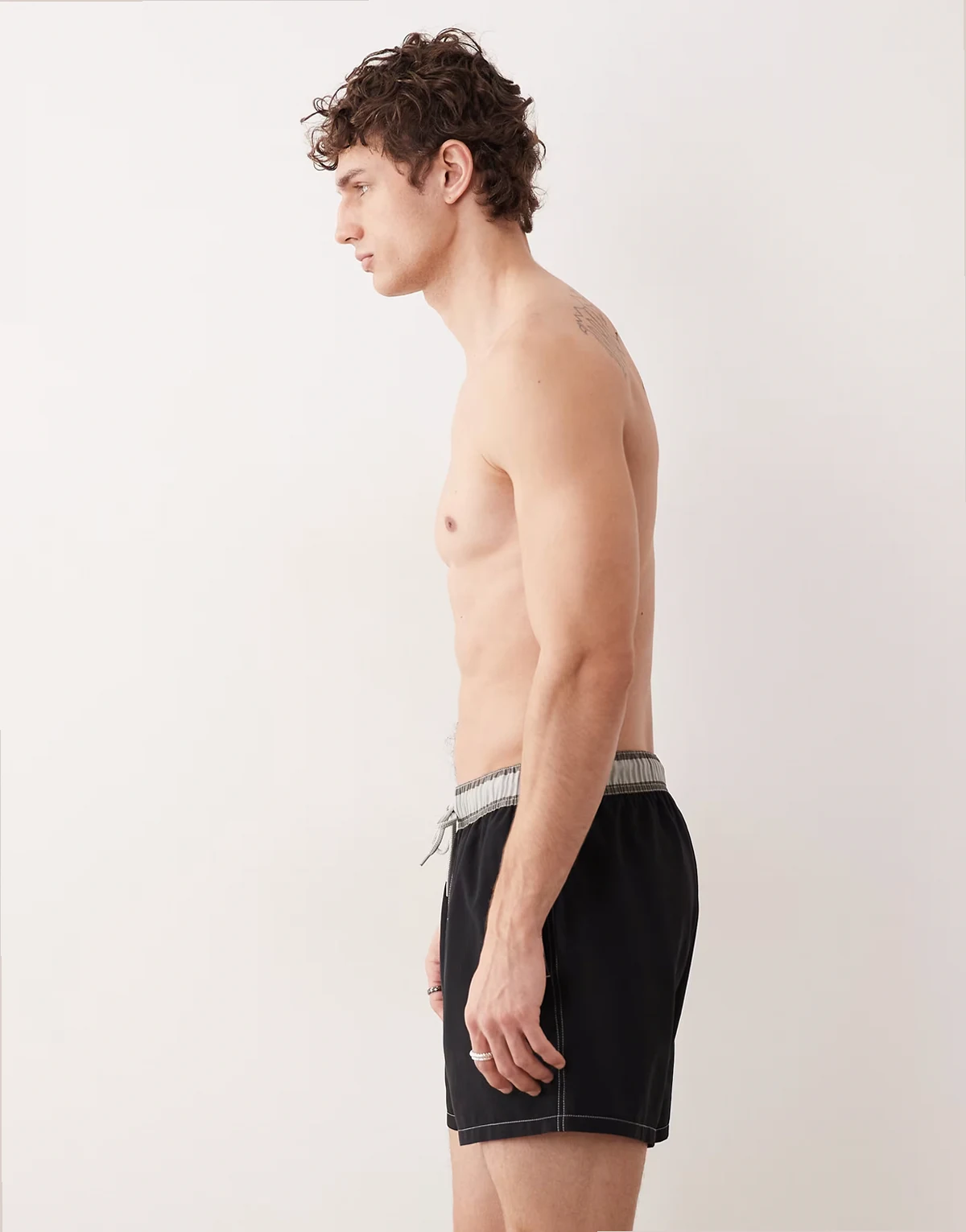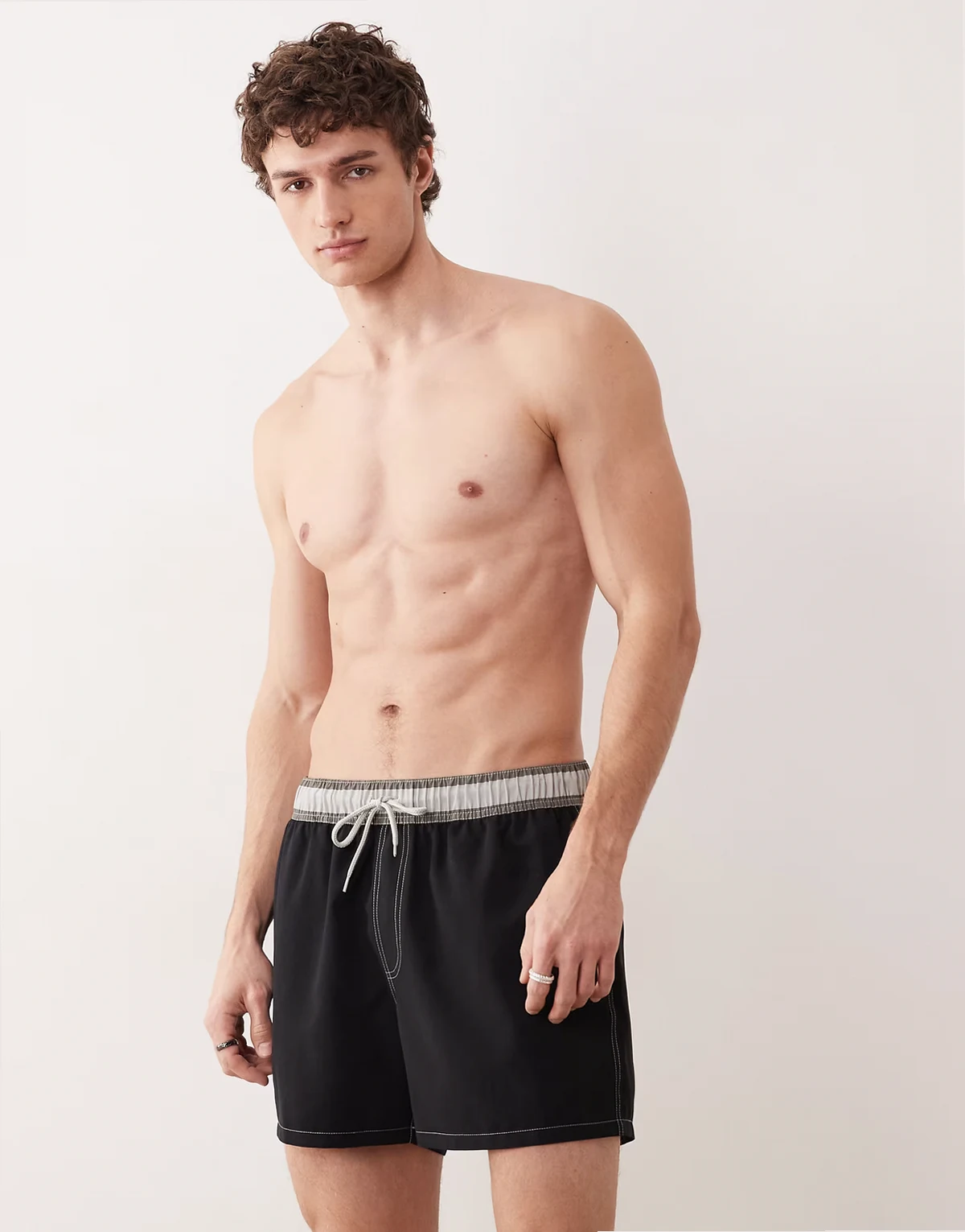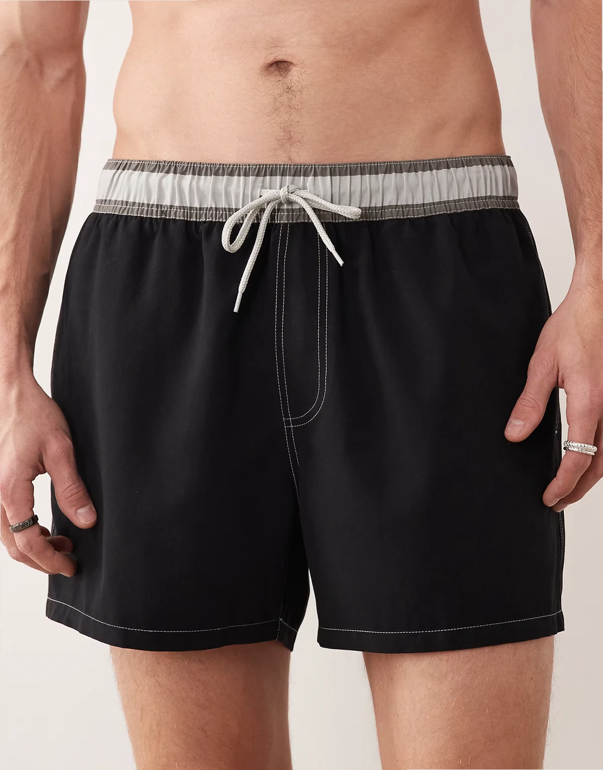 short length swim shorts with striped waistband in black