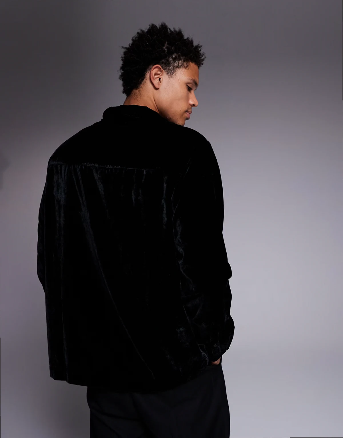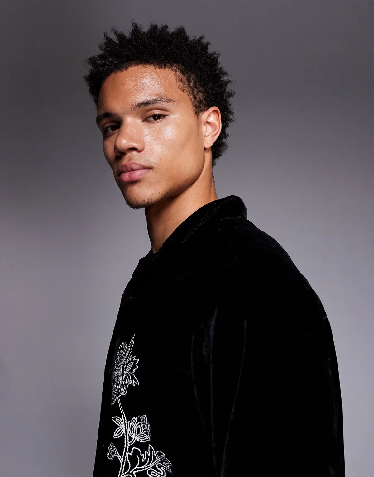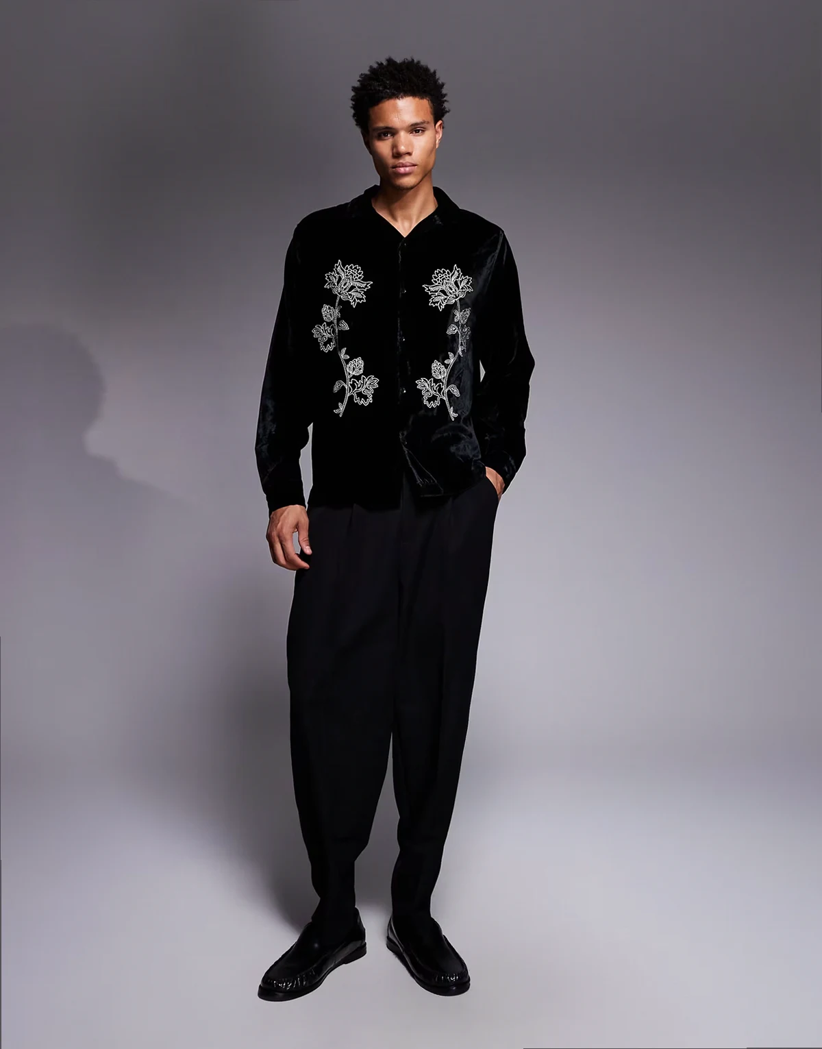 relaxed velvet shirt with floral embroidery in black