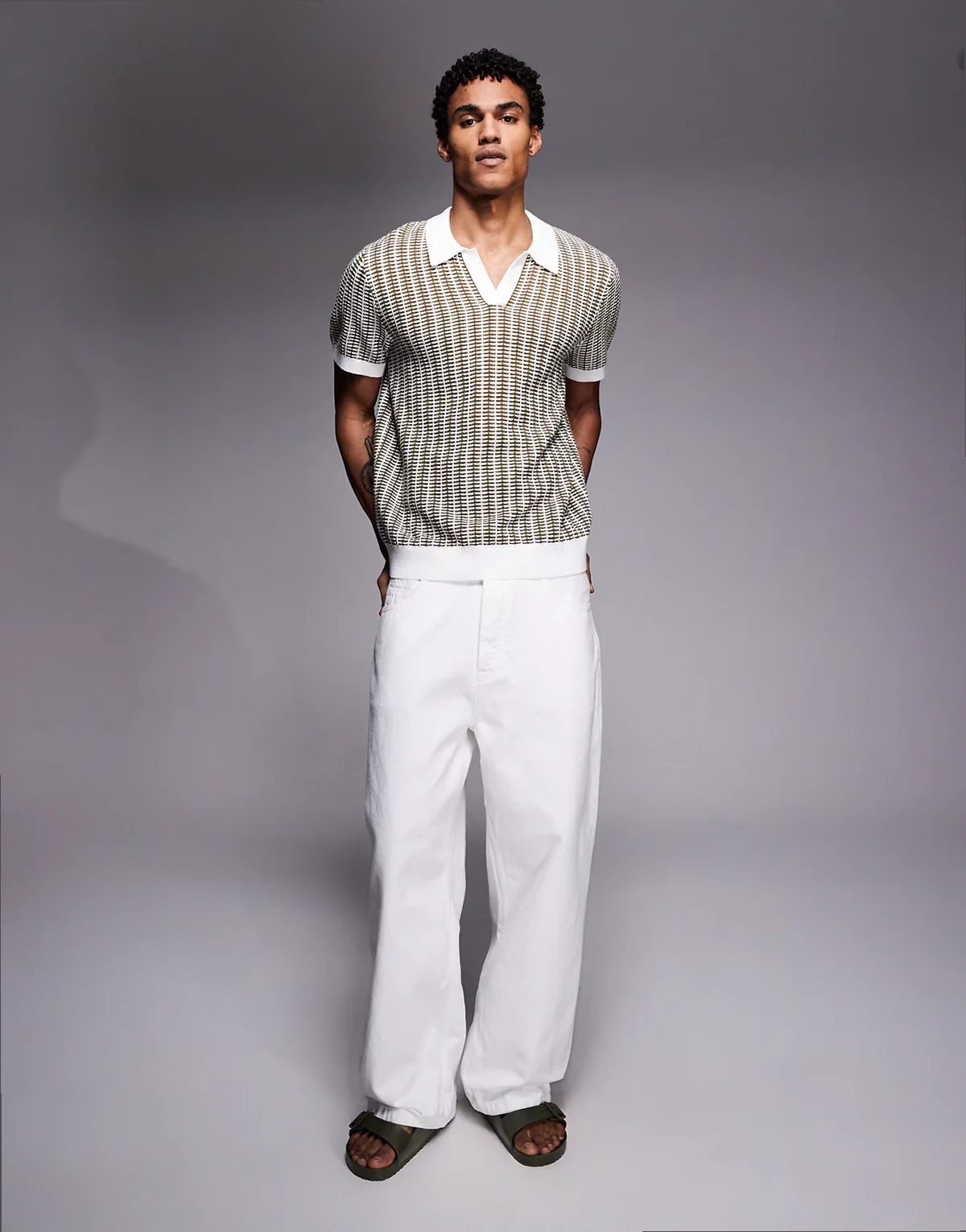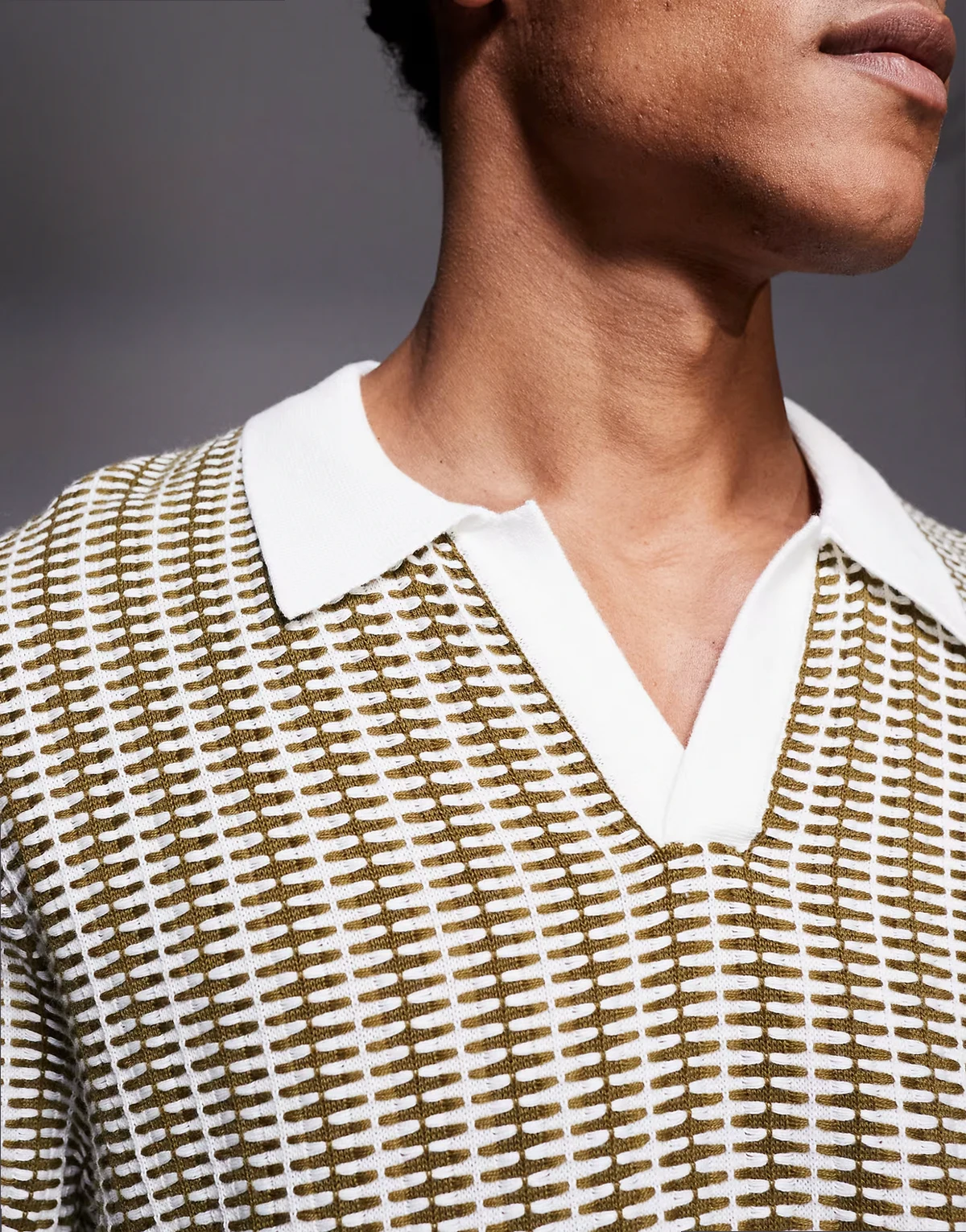 camp collar knit polo shirt in khaki stripes