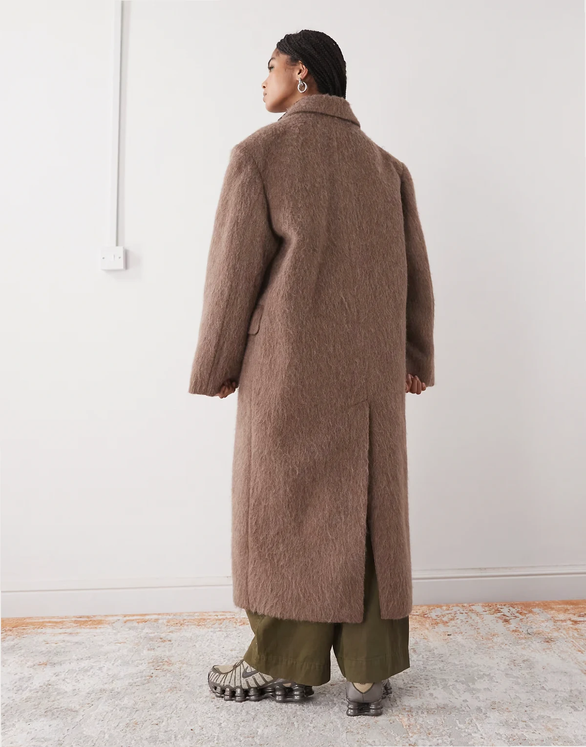 hairy alpaca & wool look oversized coat with exaggerated shoulders in brown