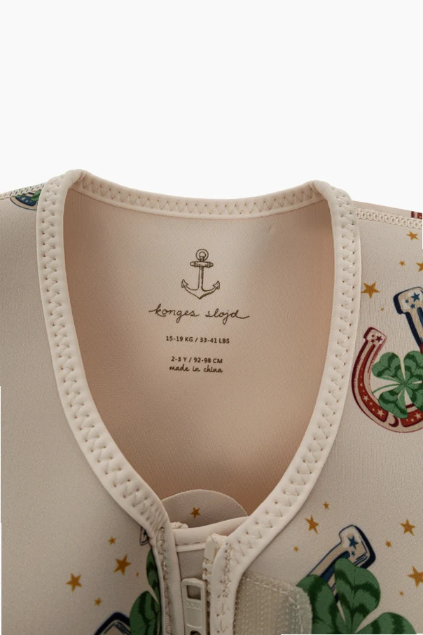 Discover the refined sophistication of the Ellis Swim Vest by Konges Sløjd , thoughtfully crafted for both safety and style. This classic sleeveless vest features a front zipper and a subtle safety strap, elegantly fastened beneath for secure aquatic adventures. The fabric, with its smooth, gently lustrous finish, showcases the resilience of waterproof, quick-drying neoprene blended with soft polyester—perfect for little swimmers.