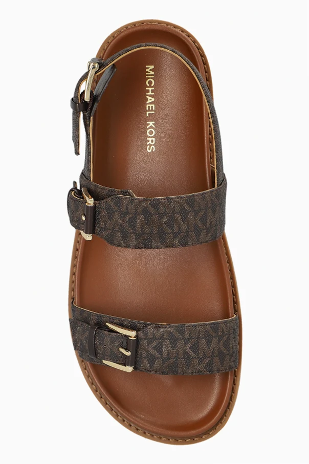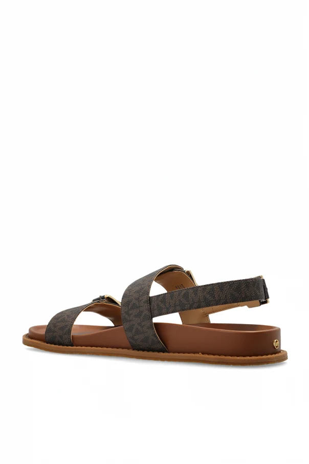 The Nia Sandals by MICHAEL Michael Kors exude timeless sophistication through their classic flat silhouette and rounded open toe. Crafted from refined synthetic leather and premium textiles, the dark straps showcase a distinctive monogram motif, reflecting the exclusive character of designer collections. Each of the three straps features an adjustable gold-tone metal buckle, ensuring a tailored fit while adding a hint of opulence.