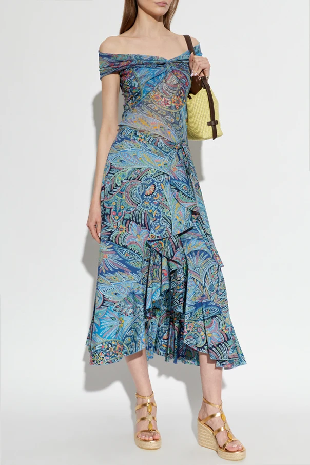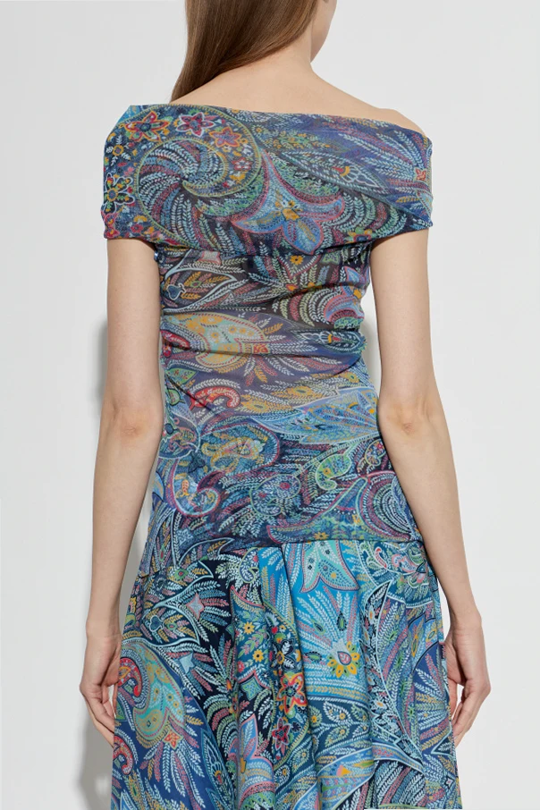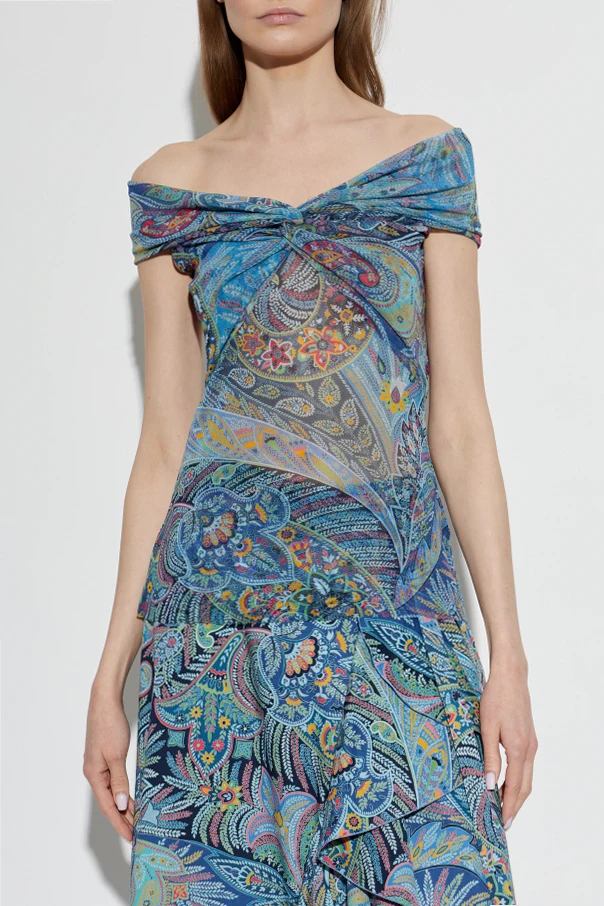 Experience a harmonious blend of sophistication and artistry with this Patterned Top with Decorative Draping from Etro . Crafted from airy, semi-sheer polyamide reminiscent of silk chiffon, this form-fitting blouse gracefully accentuates the shoulders with its broad, off-the-shoulder turtleneck neckline. The exquisite draping and front twist effect lend subtle drama and timeless allure.