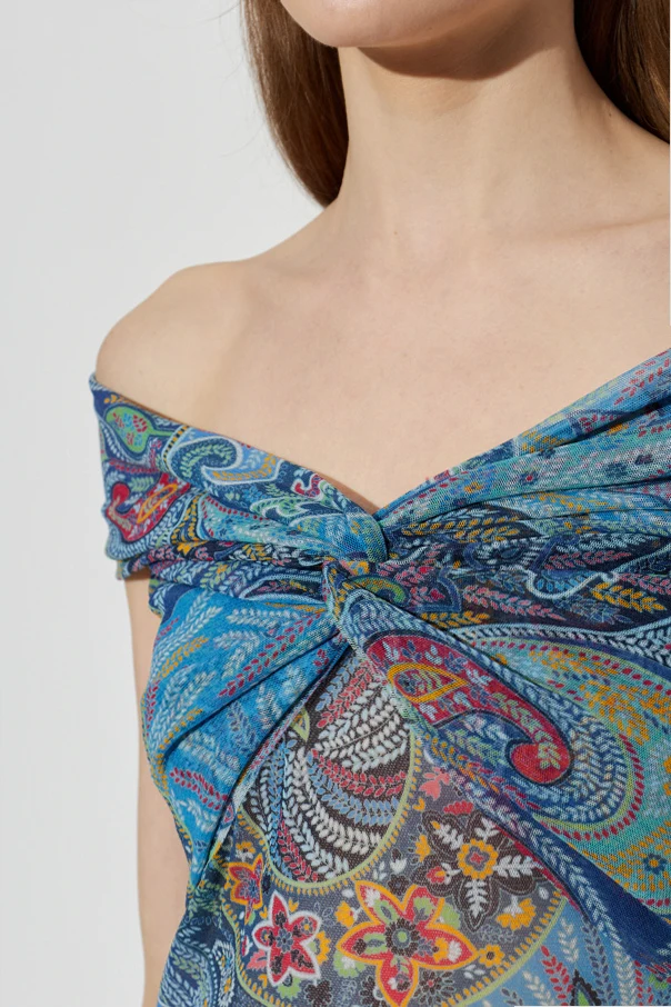The opulent paisley motif—rendered in vibrant multicolor with intricate florals and geometric elements—commands attention and infuses the top with striking exclusivity. The neckline, free of logos or inscription, is defined solely by its elegant twisted finish, underscoring refined minimalism.