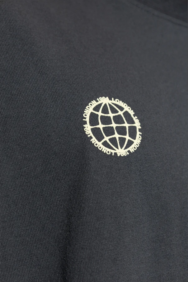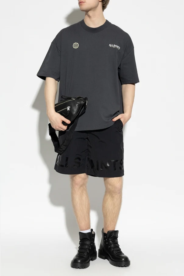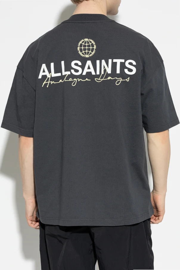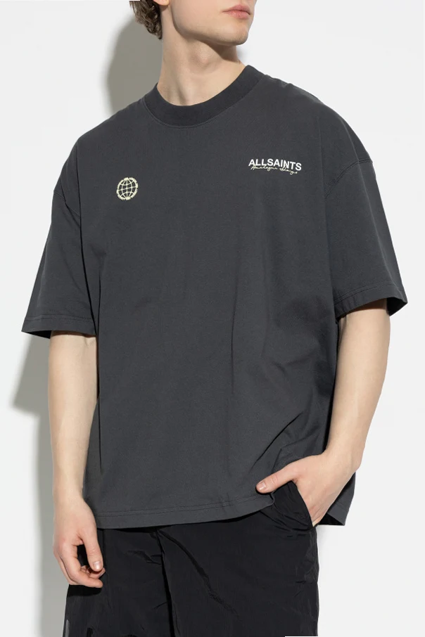Signature details set this piece apart: a prominent globus-inspired emblem and subtle text adorn the left chest, complemented by a contrasting designer logo in crisp white. The back commands attention with a bold globe motif, the designer's name 'ALLSAINTS,' and a handwritten-inspired script, evoking authentic, urban artistry.