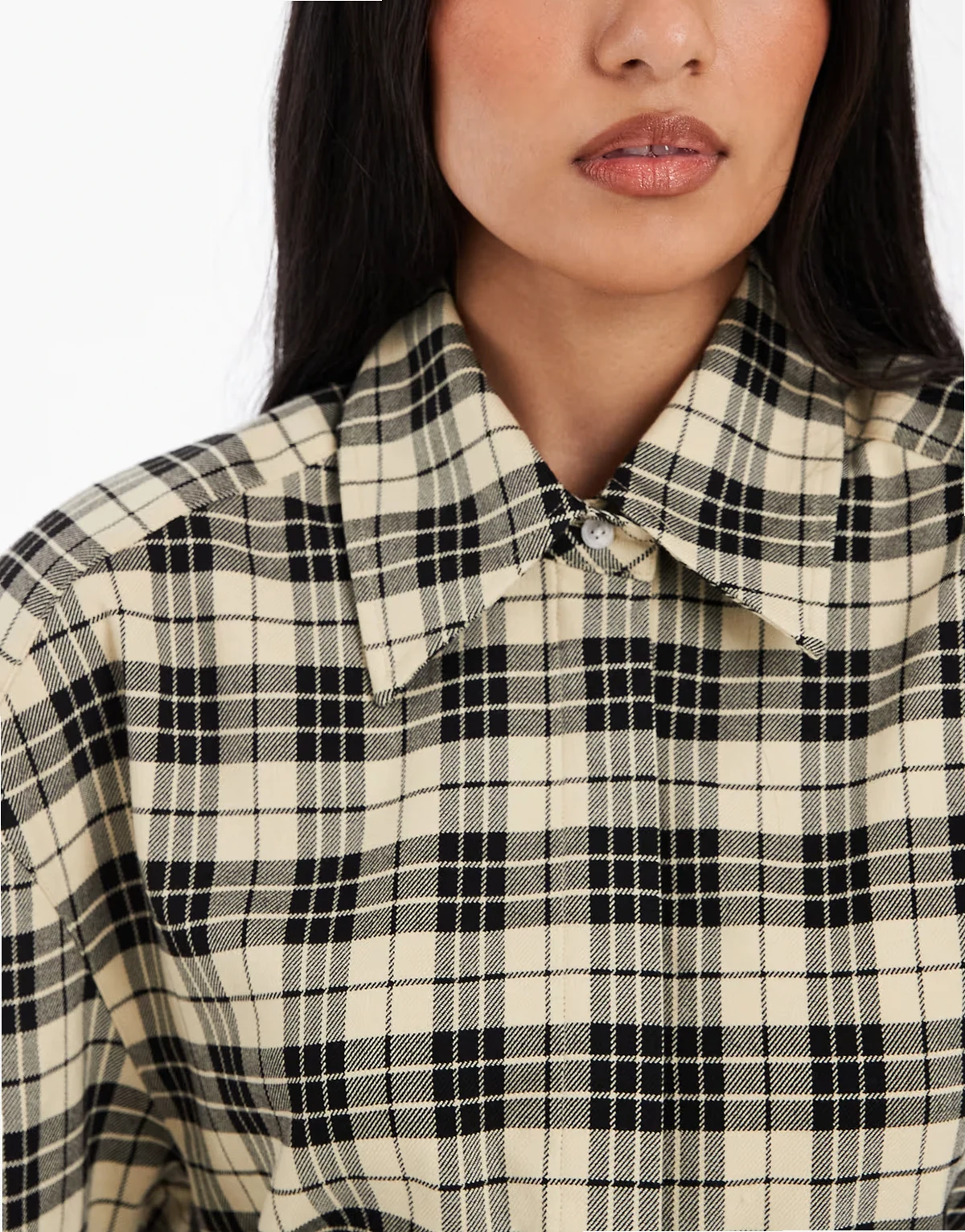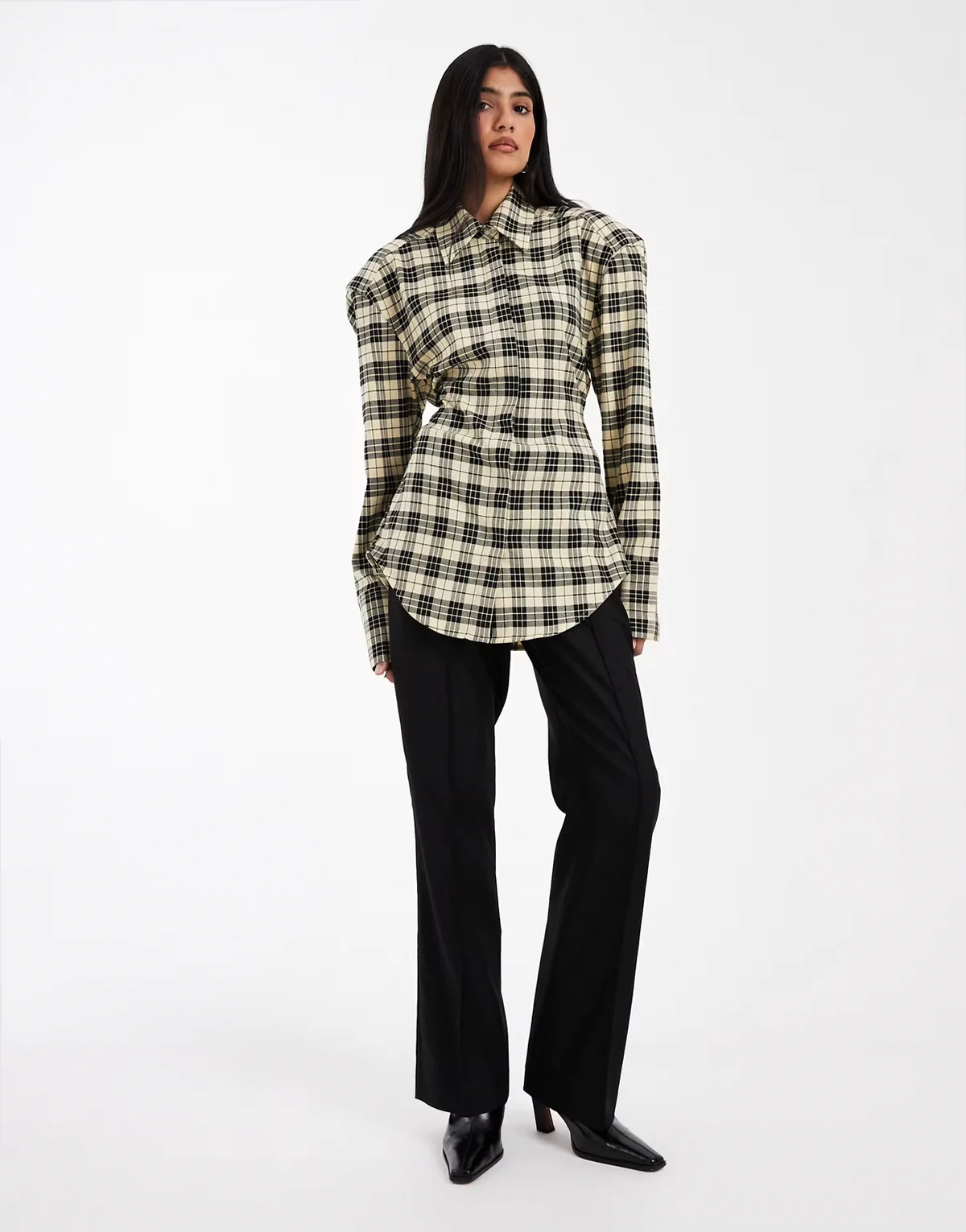 cinch waist shoulder pad shirt in brushed plaid