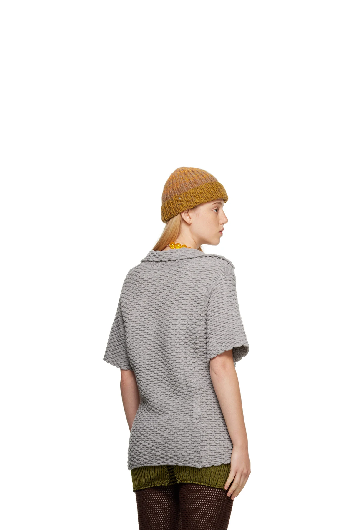 Handcrafted blister knit stretch acrylic polo.