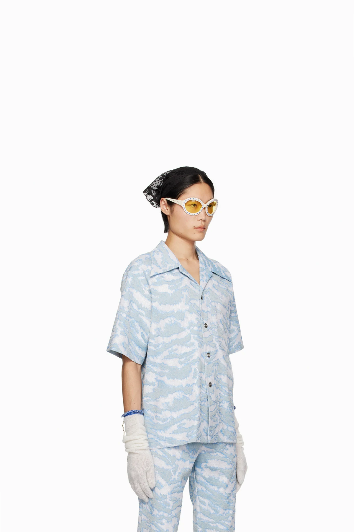 Stretch cotton-blend gobelin shirt. Metallic thread detailing and jacquard graphic pattern throughout.