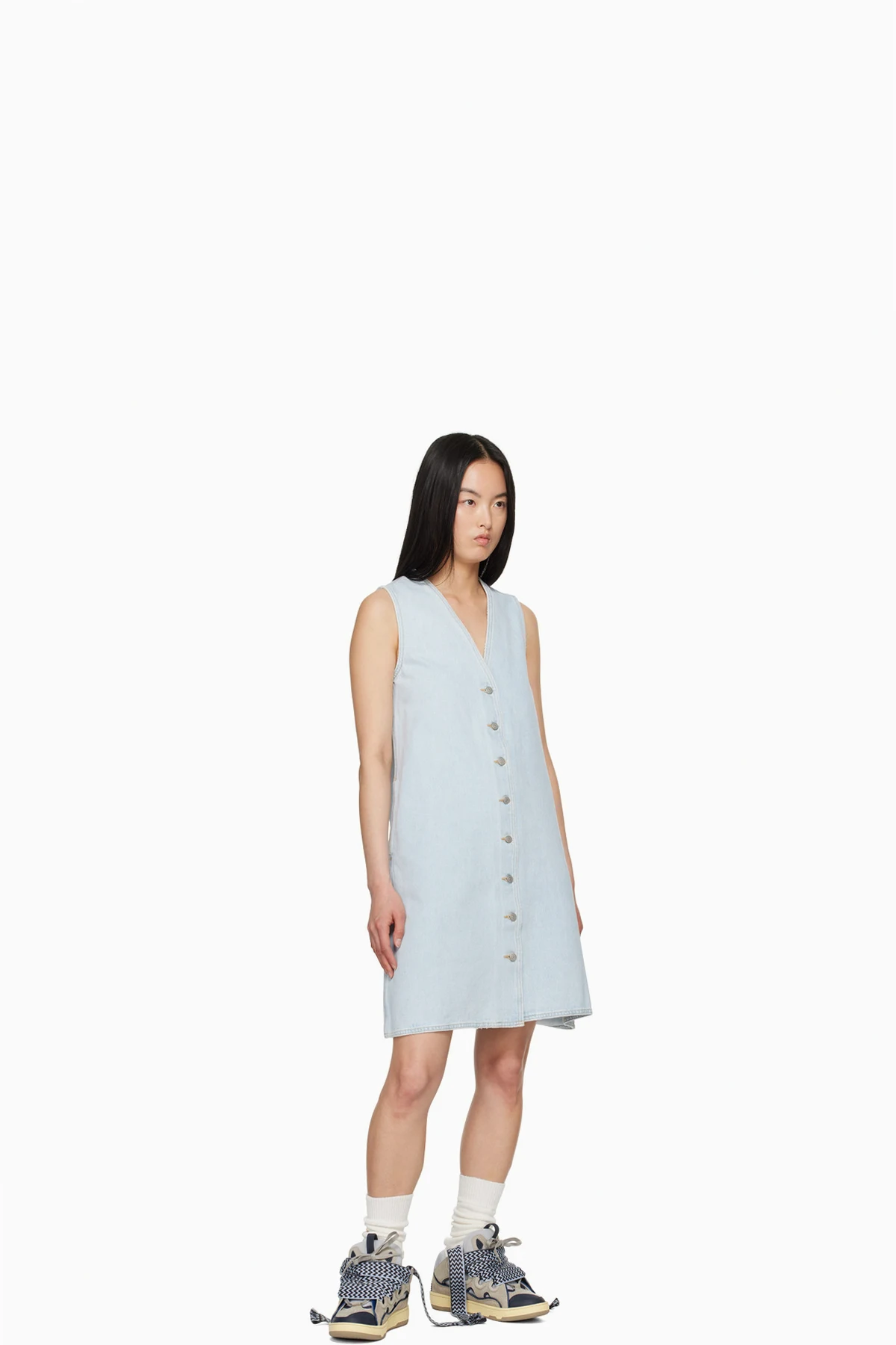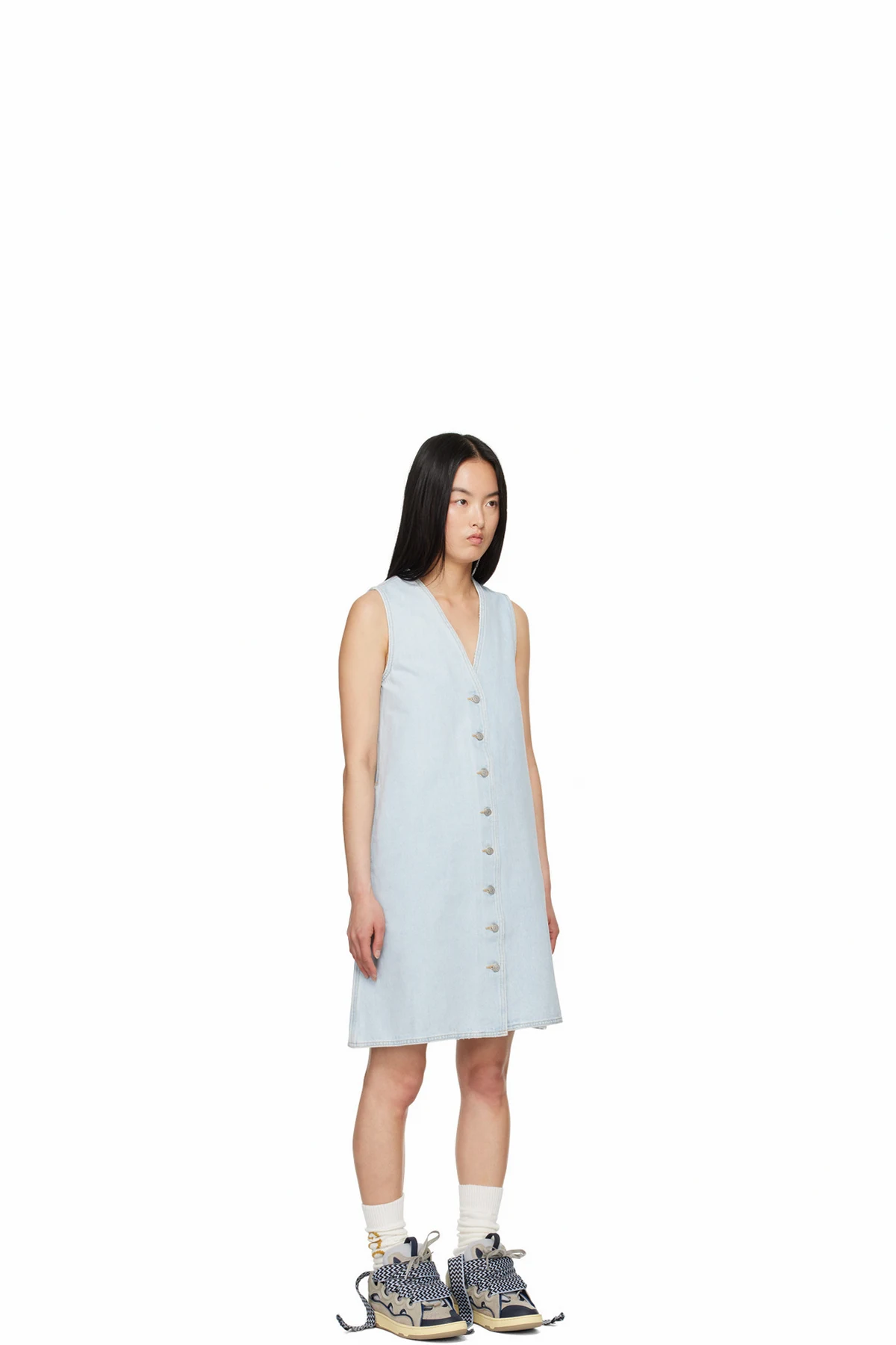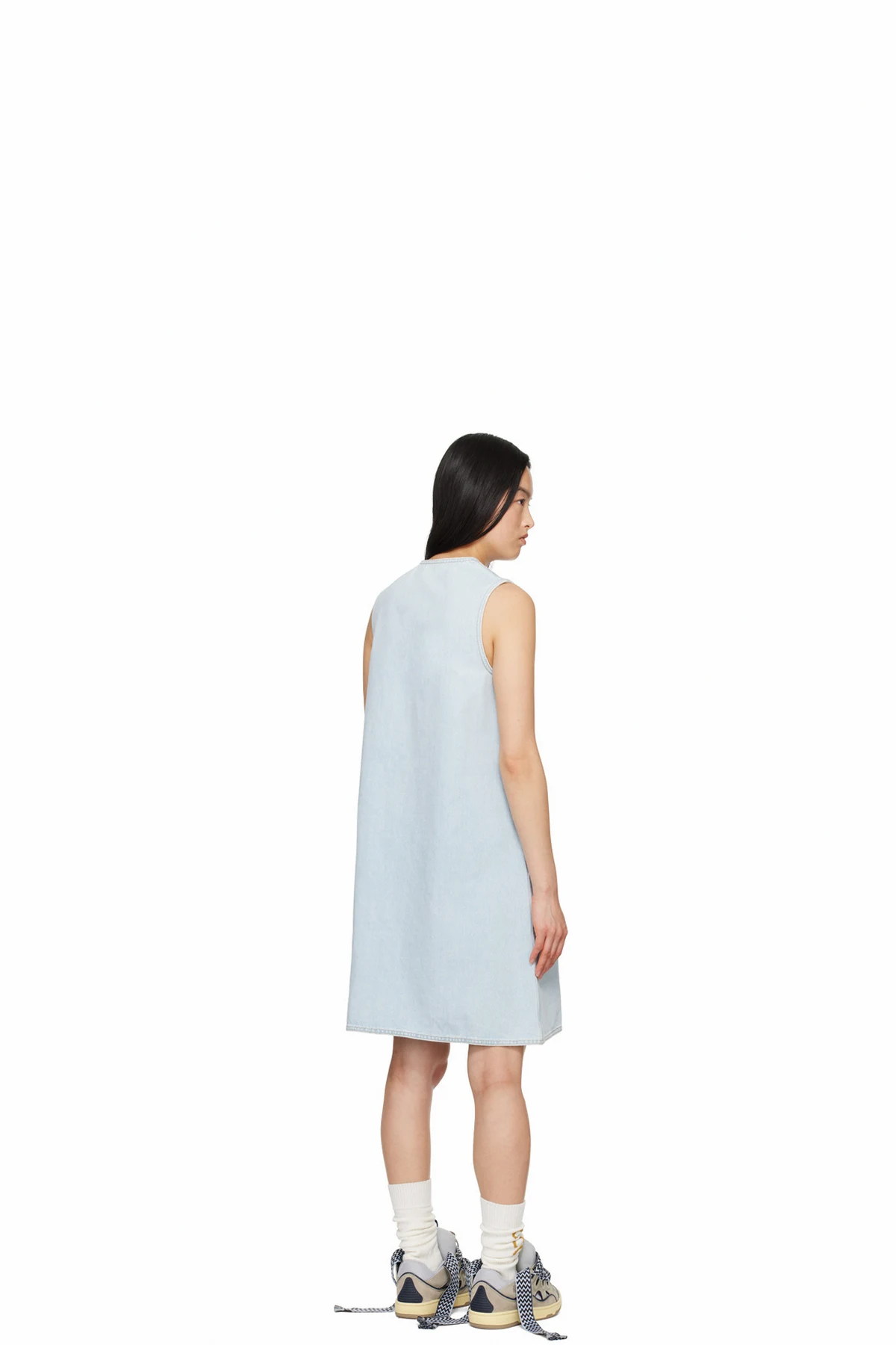 Non-stretch denim dress. Subtle distressing and fading throughout.