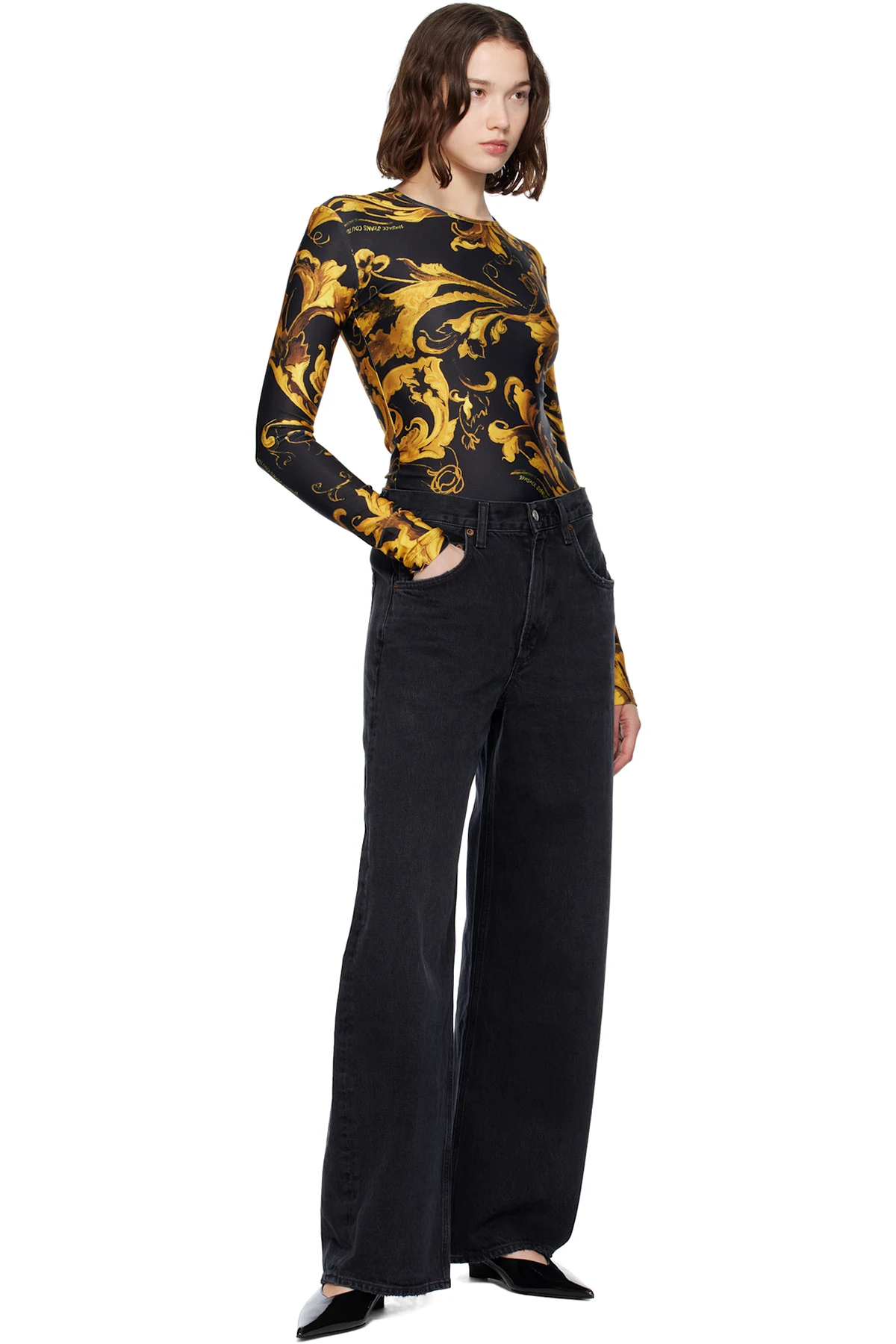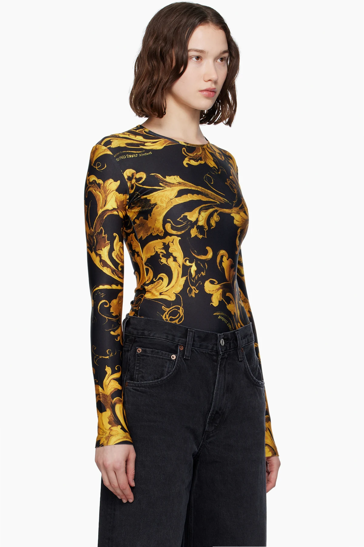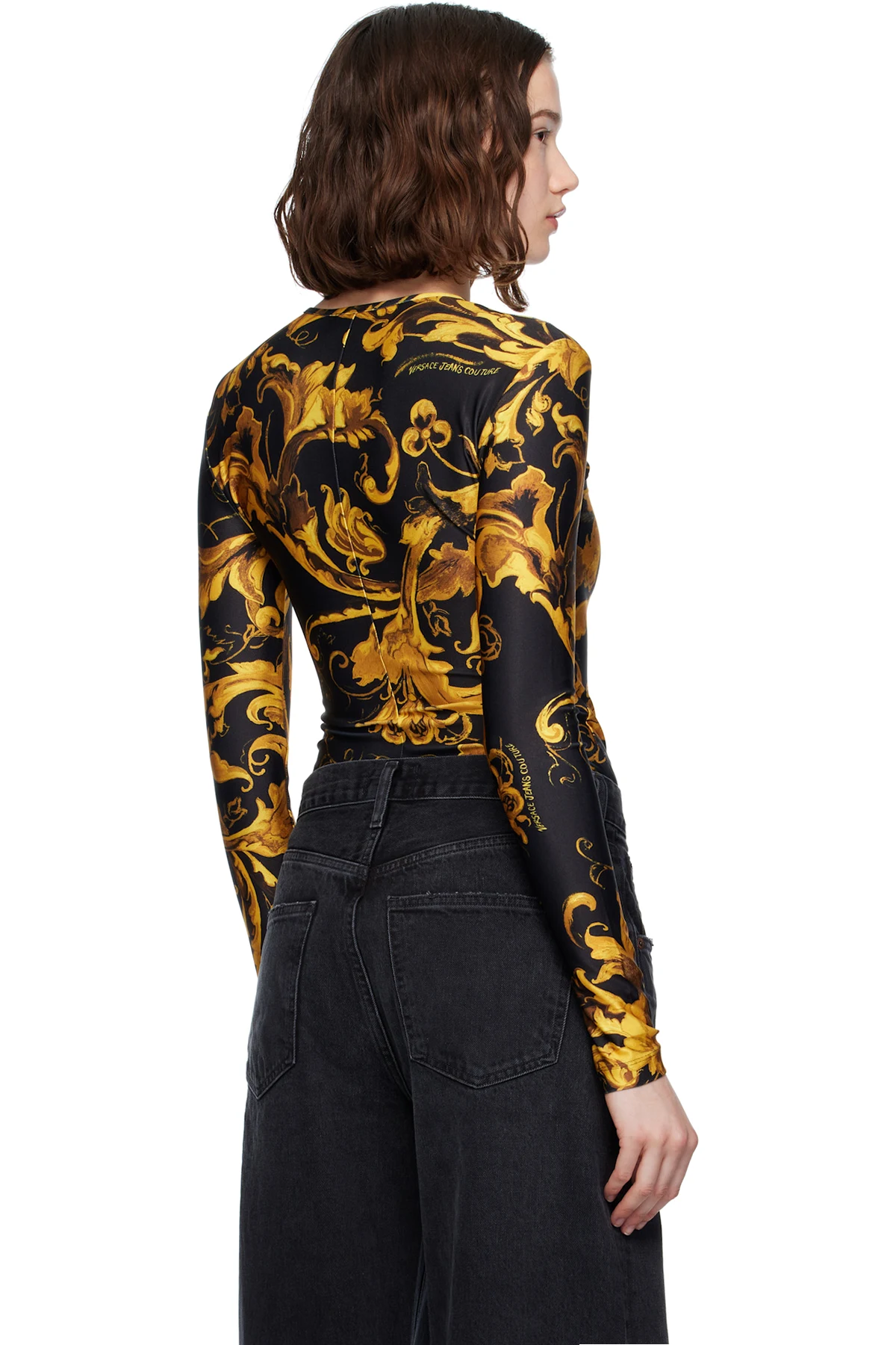 Stretch polyester jersey bodysuit. Barocco pattern printed throughout.