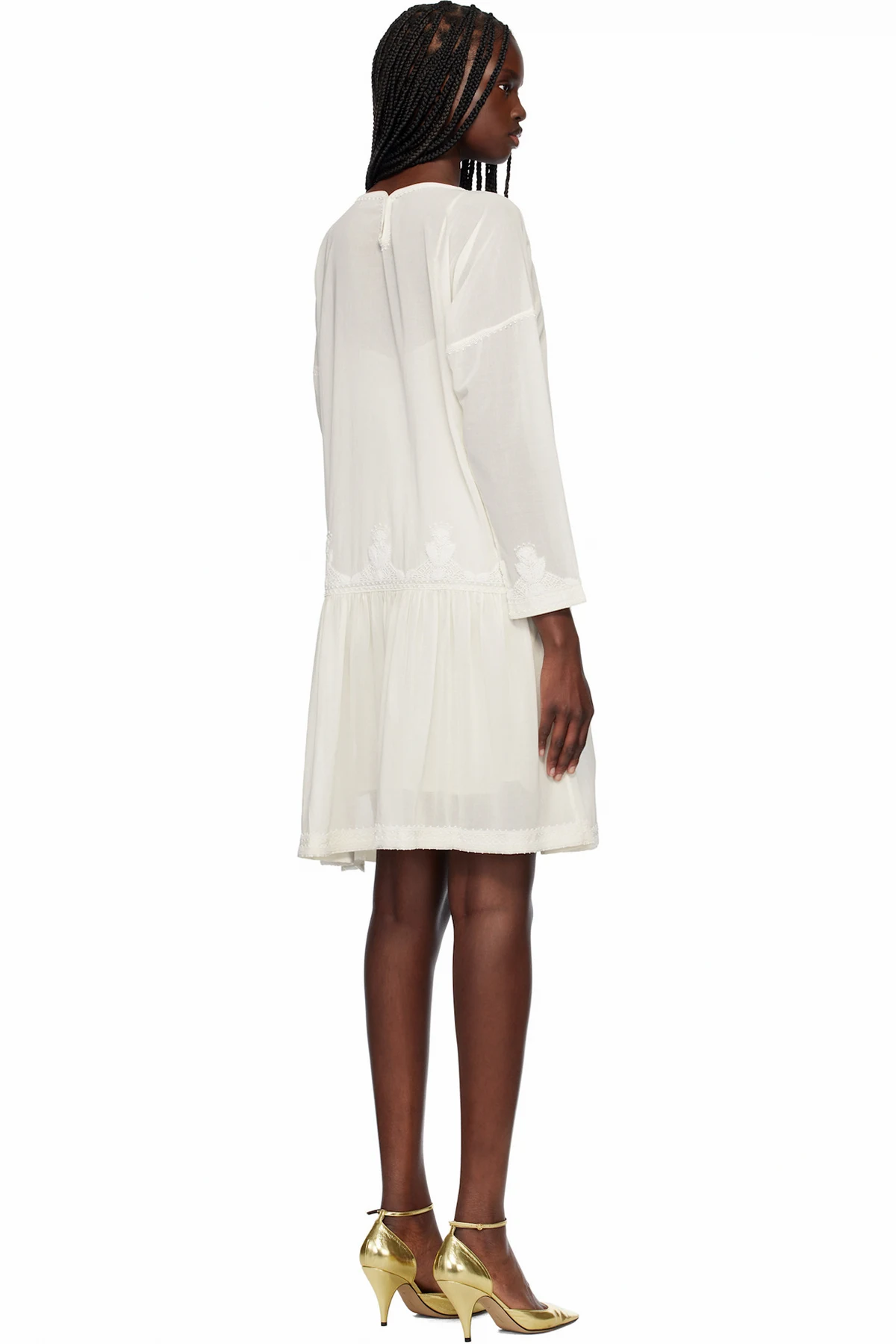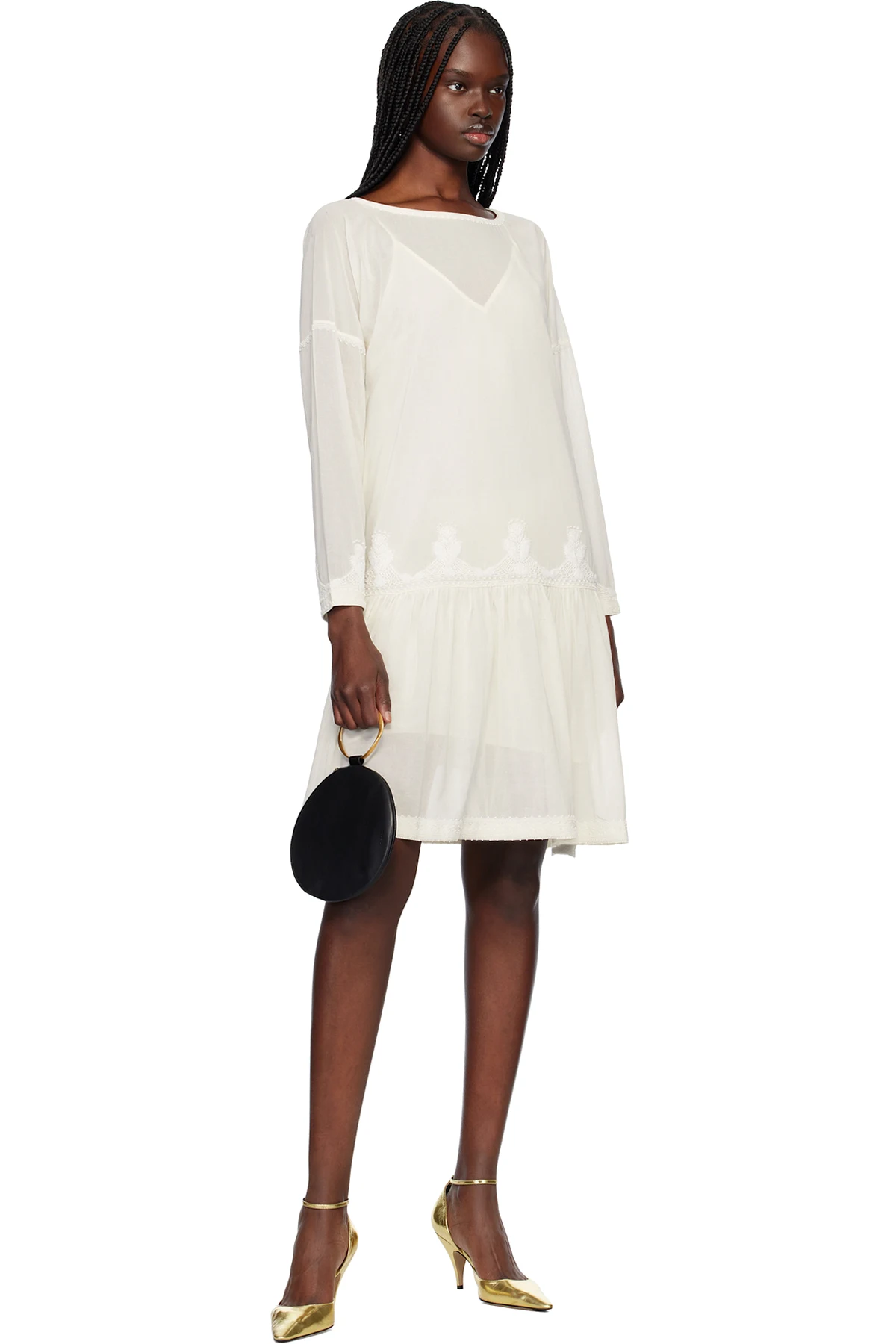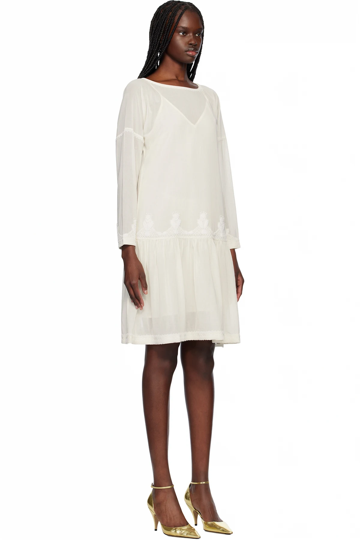 Semi-sheer cotton voile midi dress. Beaded detailing throughout.