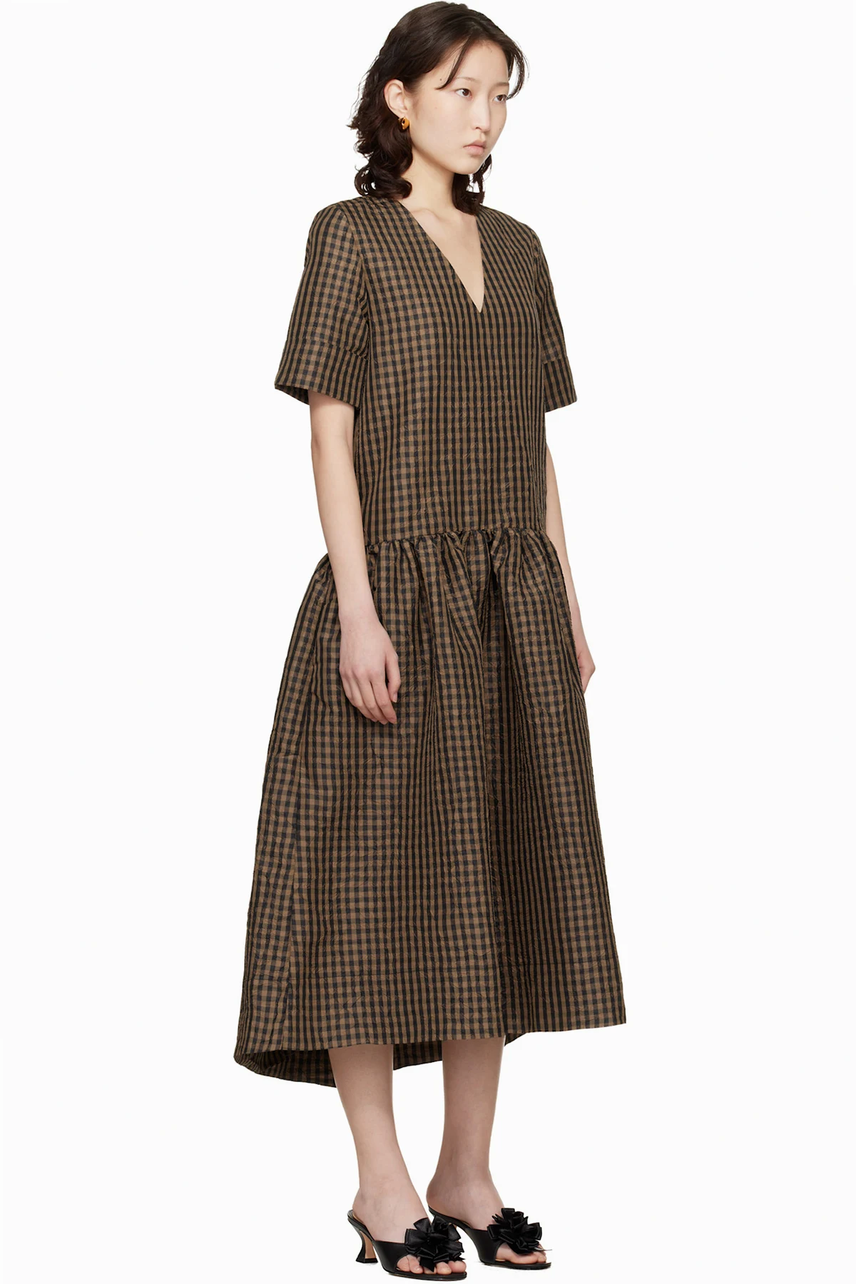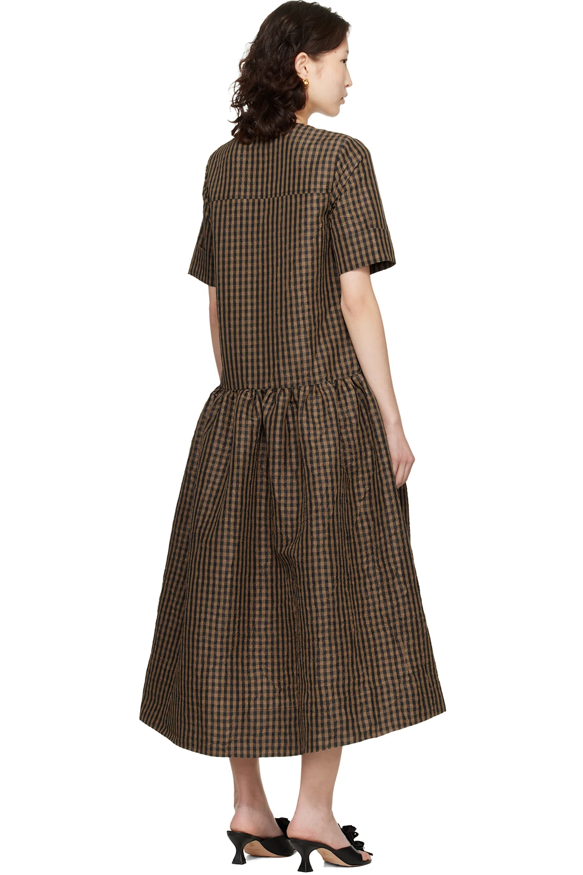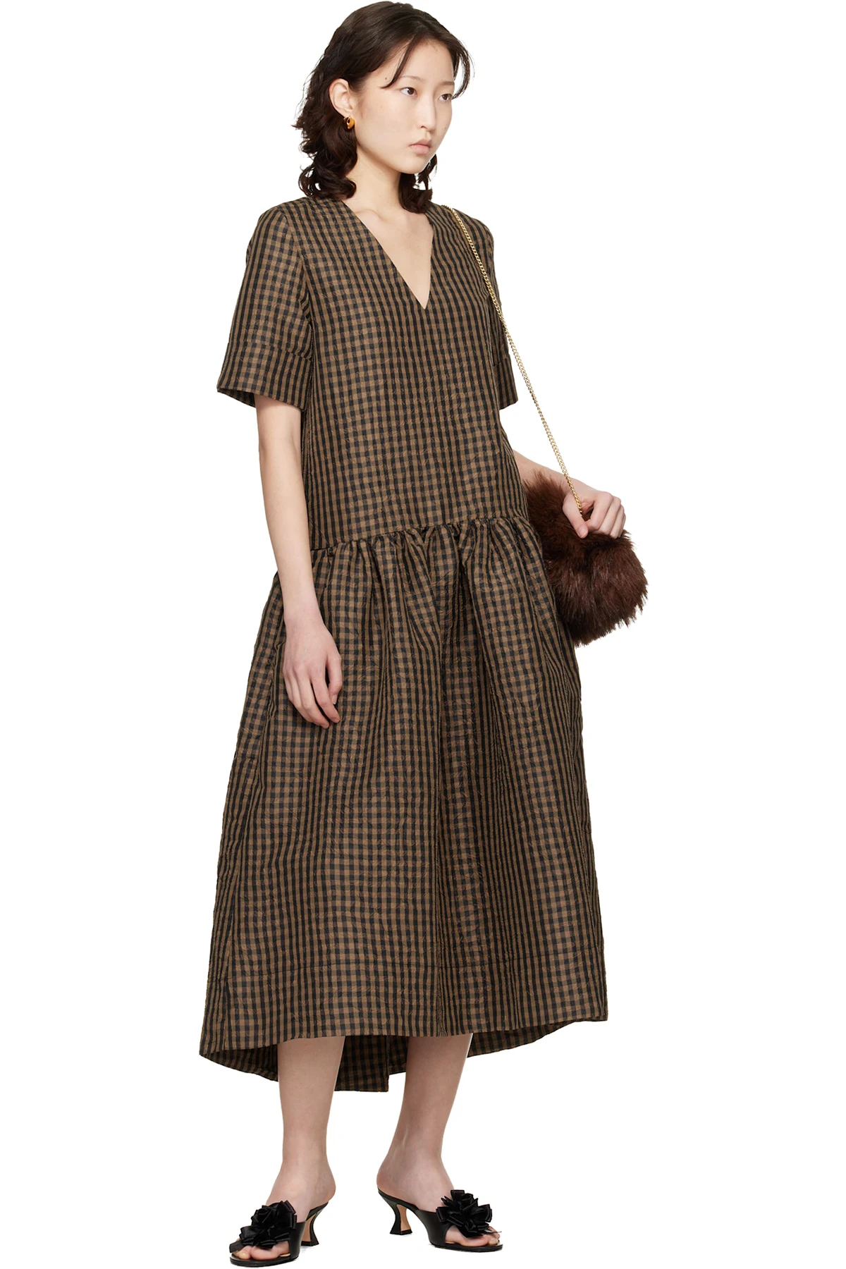 Brown Crinkled Check Maxi Dress