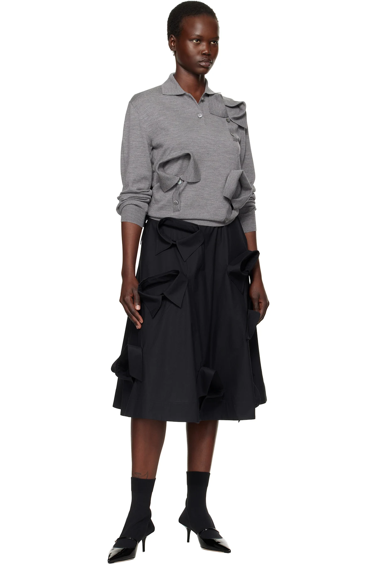Stretch cotton poplin midi skirt. Spread collar-style appliqués throughout.