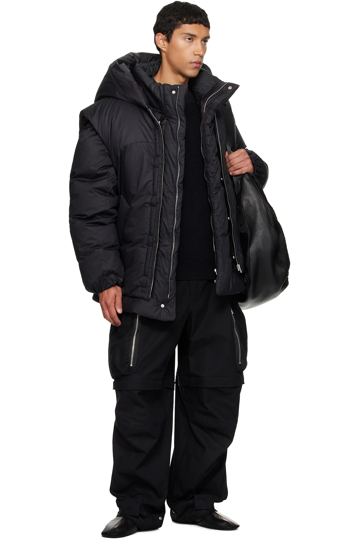 · Detachable down-filled vest-style nylon satin overlay