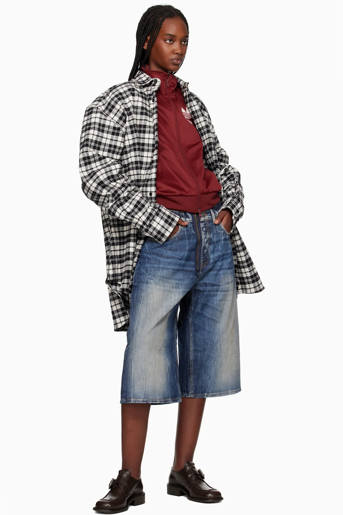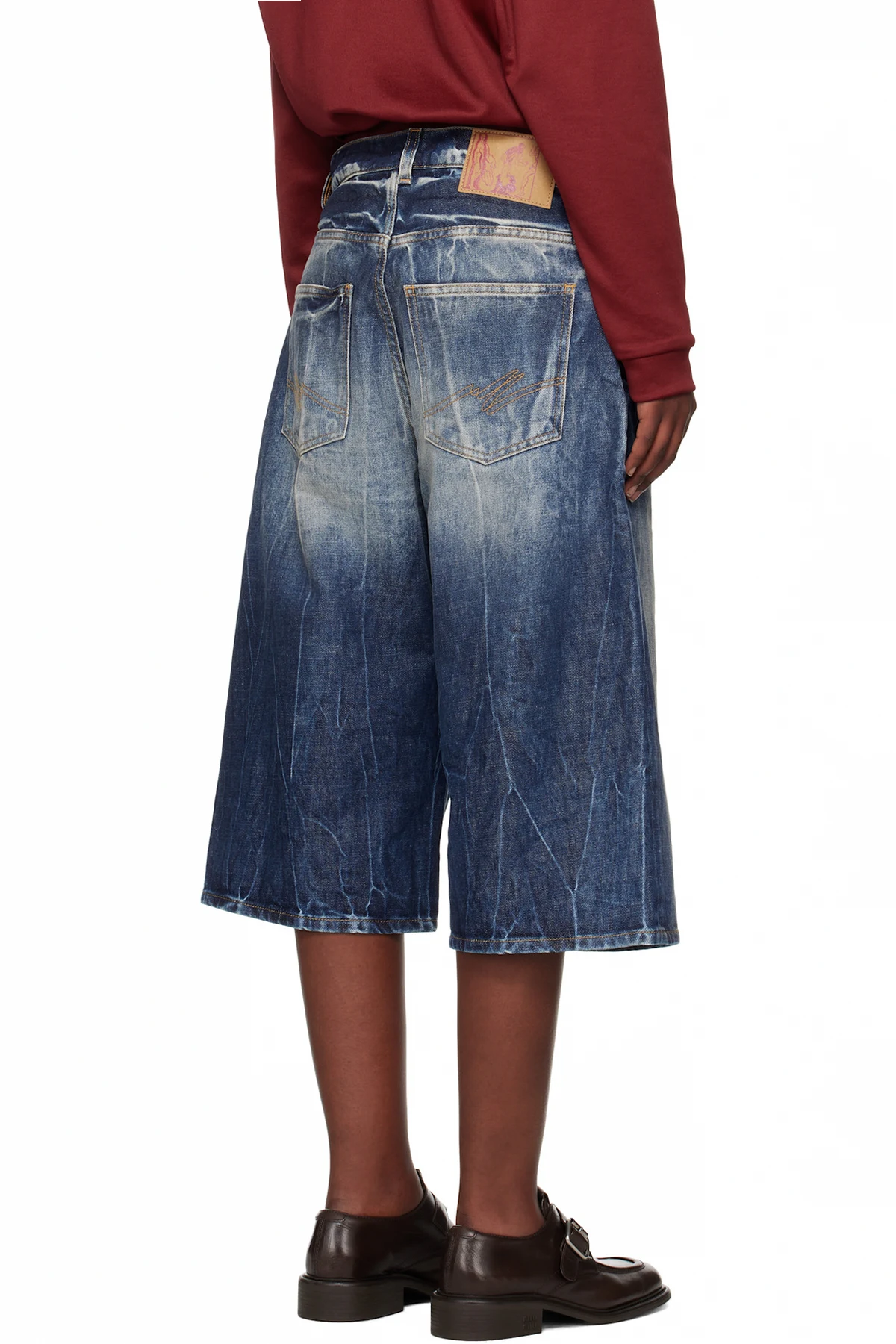 Non-stretch denim shorts. Bleaching, fading, and whiskering throughout.