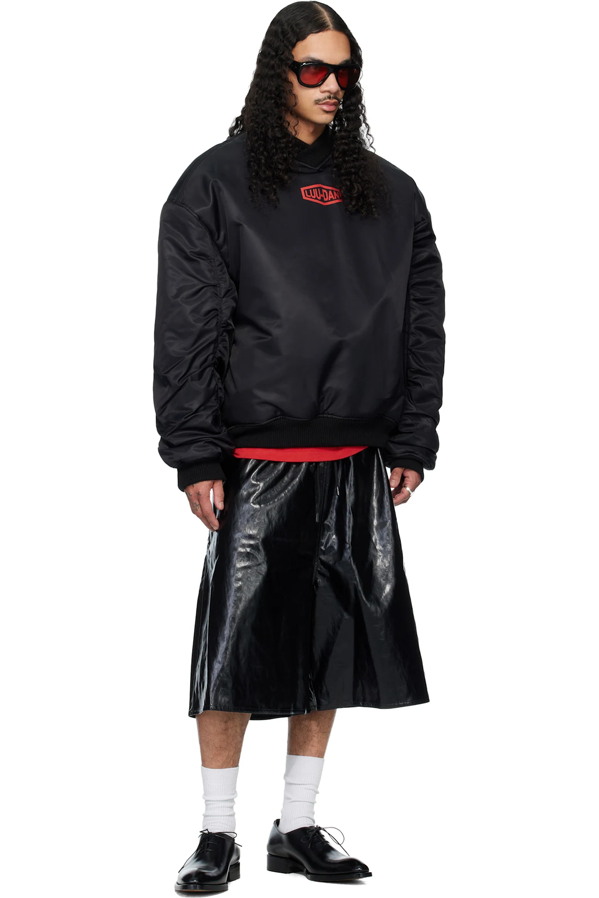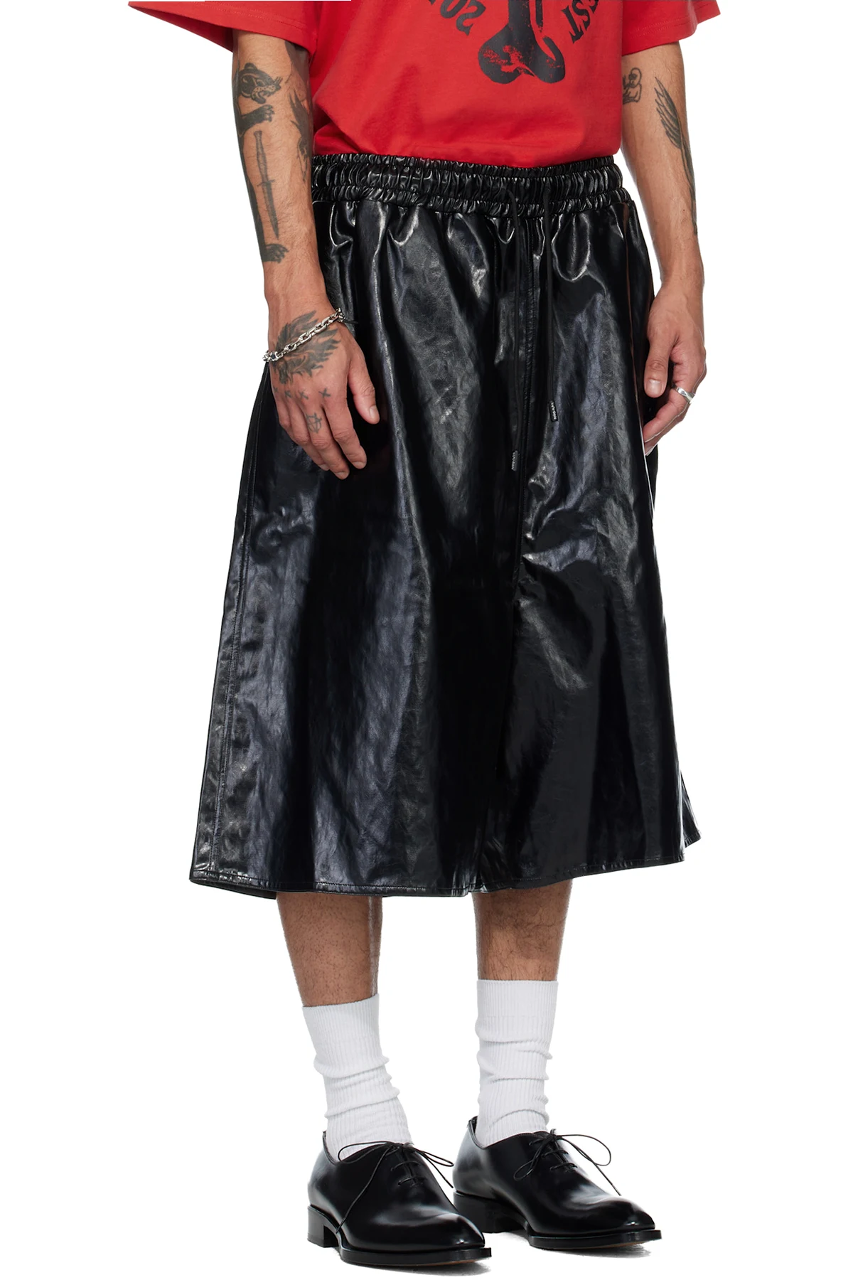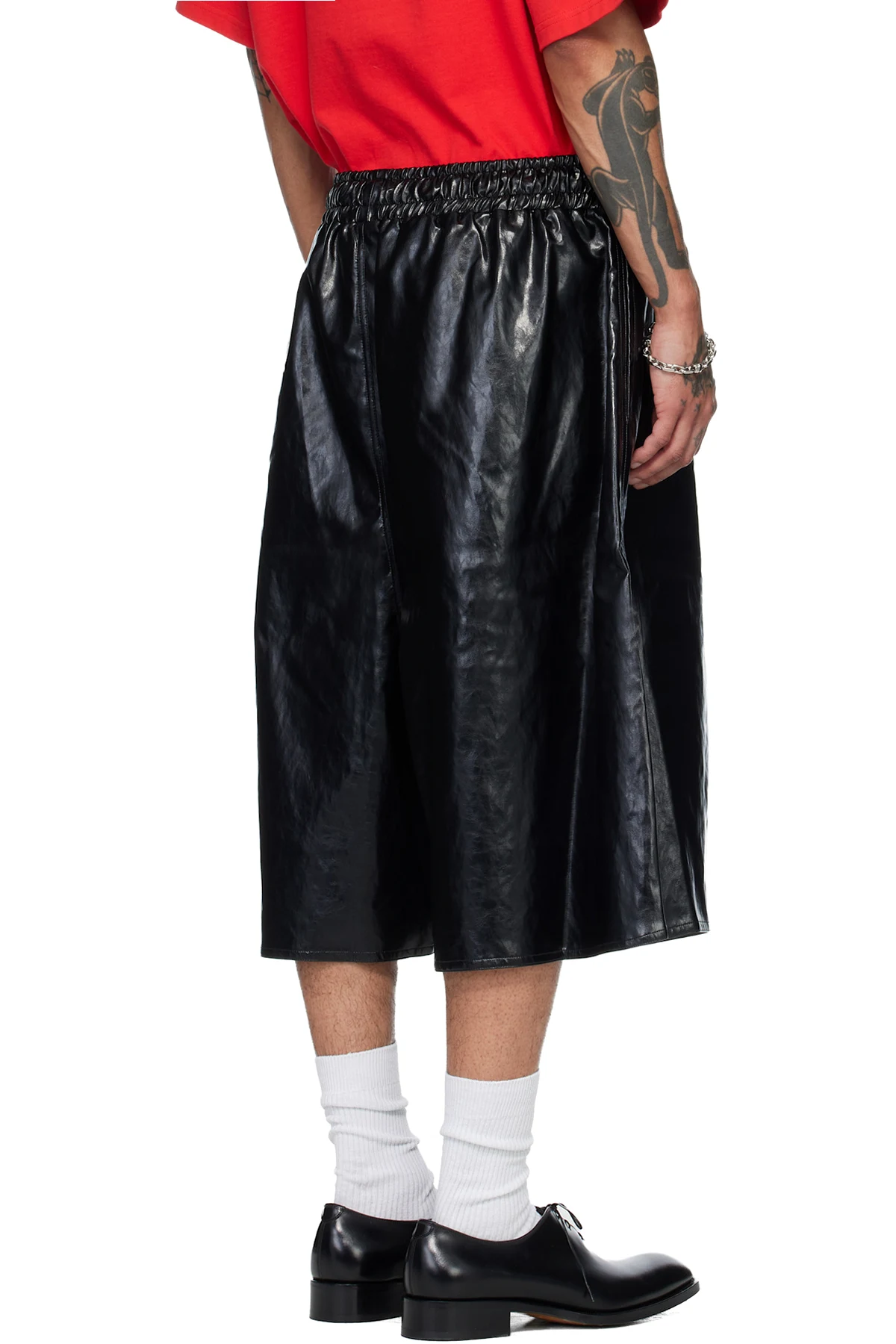 Creased faux-leather shorts.