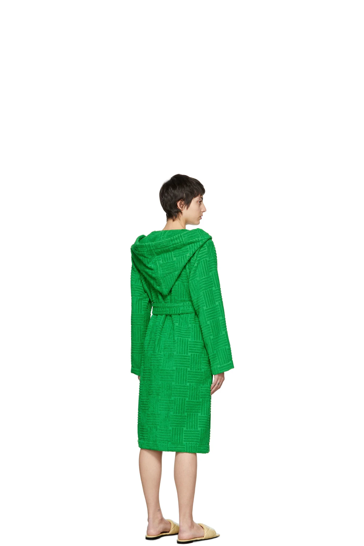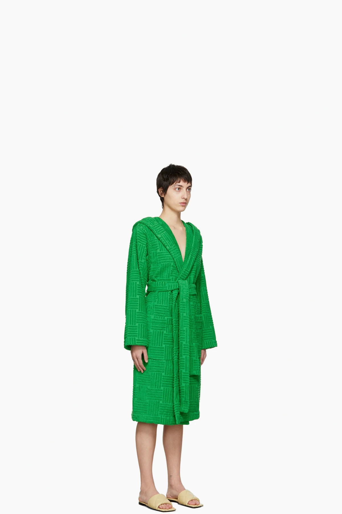 Long sleeve terry cloth bath robe in green featuring embossed graphic pattern.