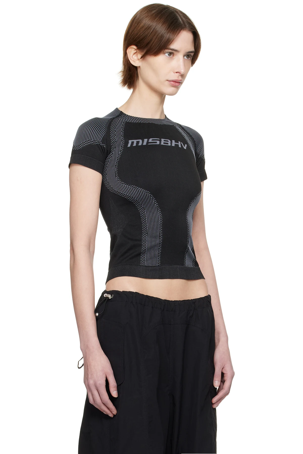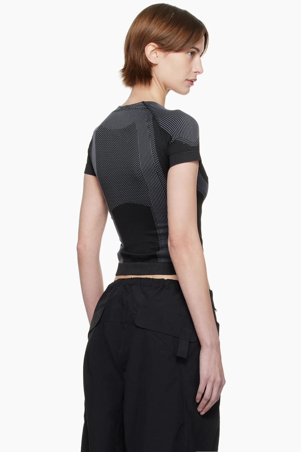 Stretch recycled nylon-blend jersey sport T-shirt. Jacquard stripes and check pattern throughout.
