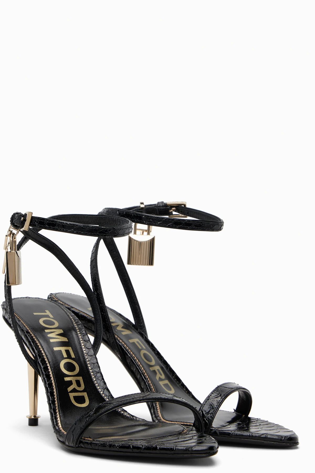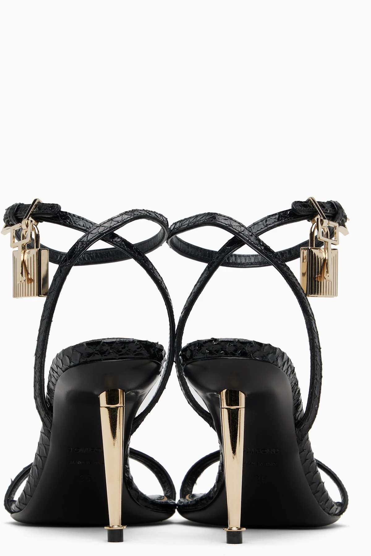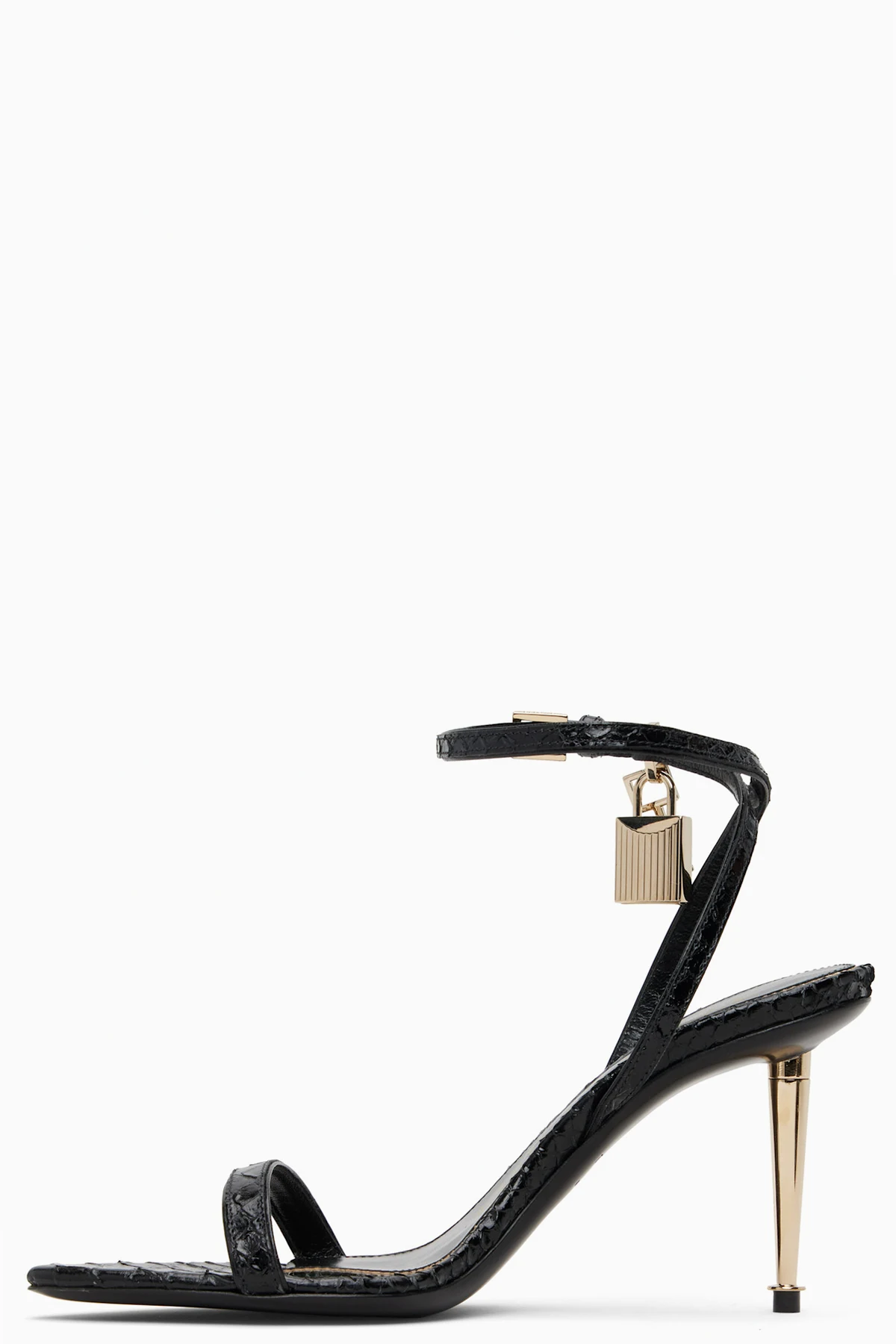 · Padlock and key charm at pin-buckle ankle strap