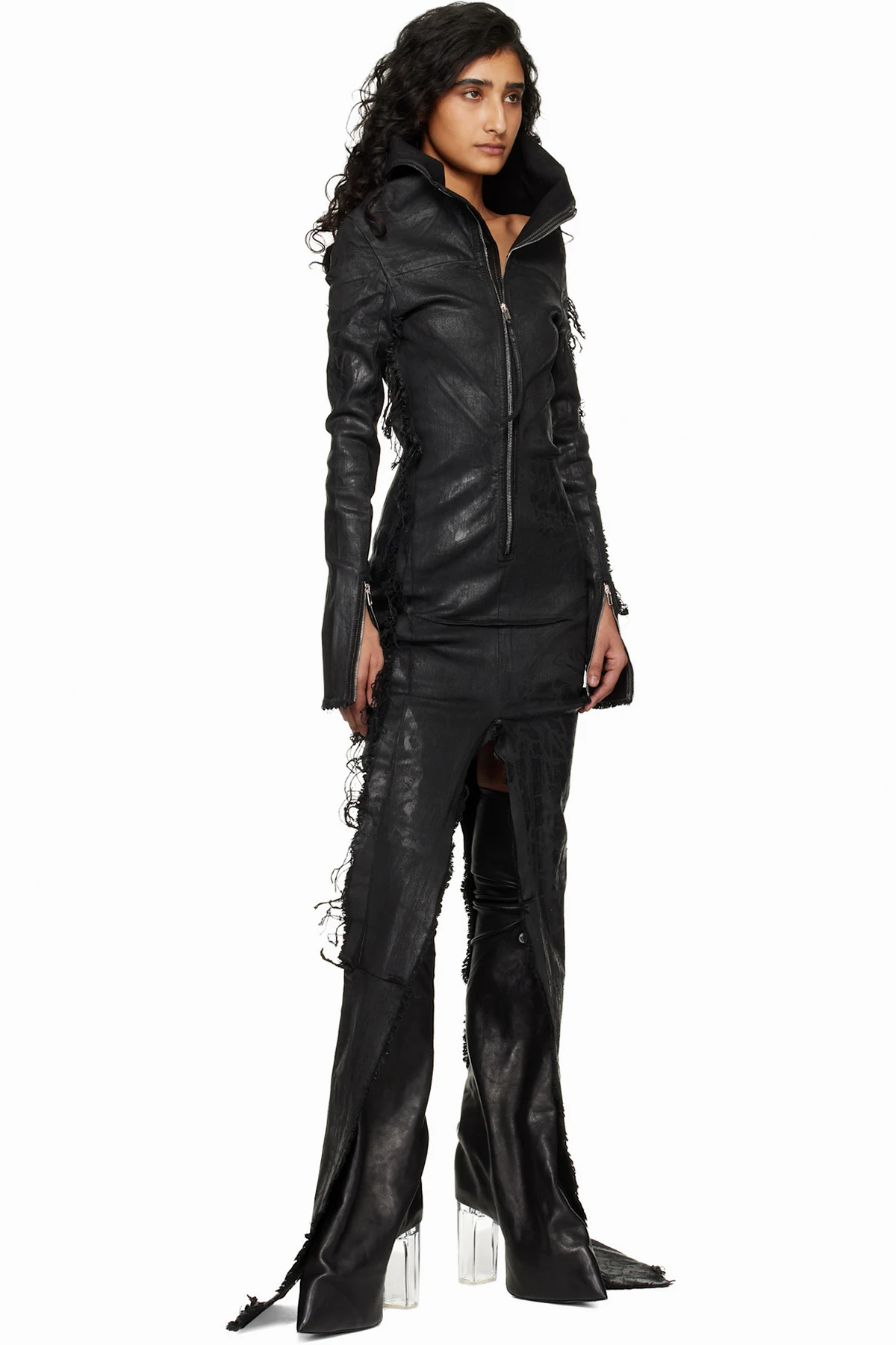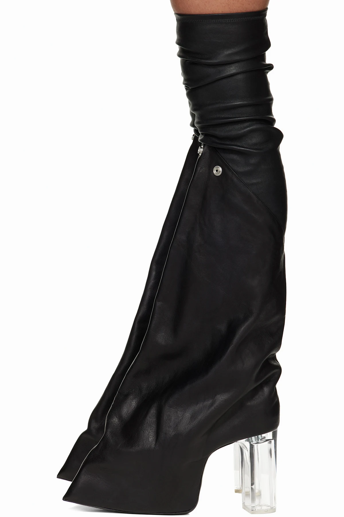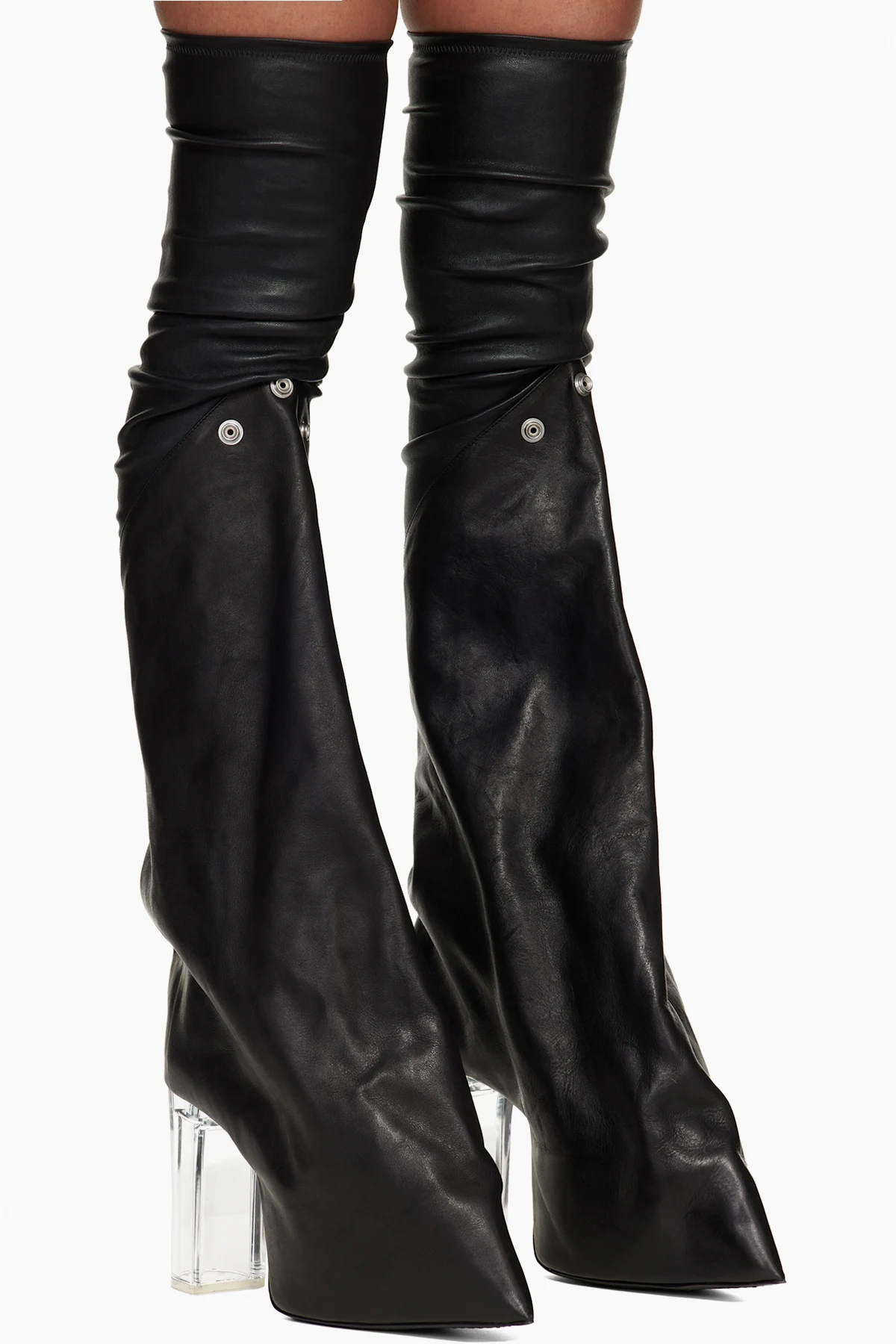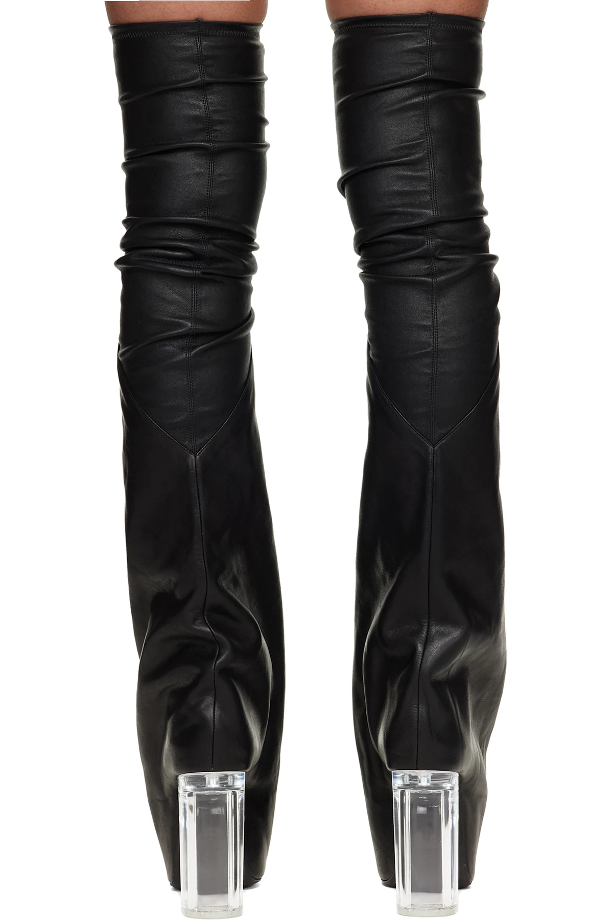 Thigh-high stretch buffed lambskin and grained calfskin boots.