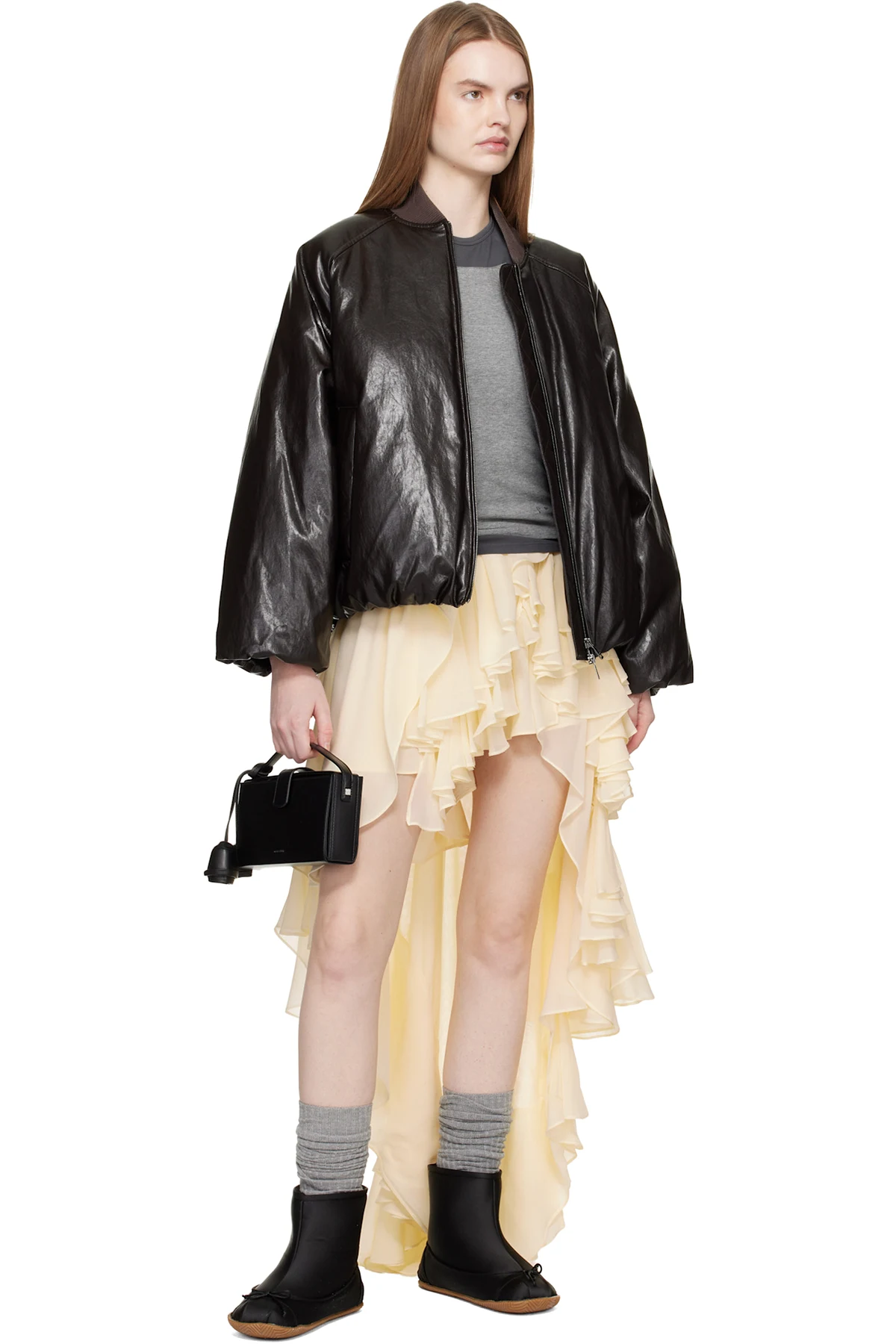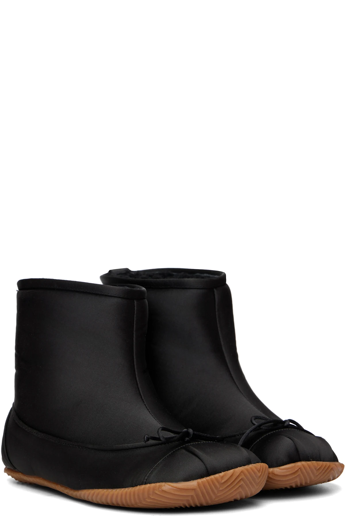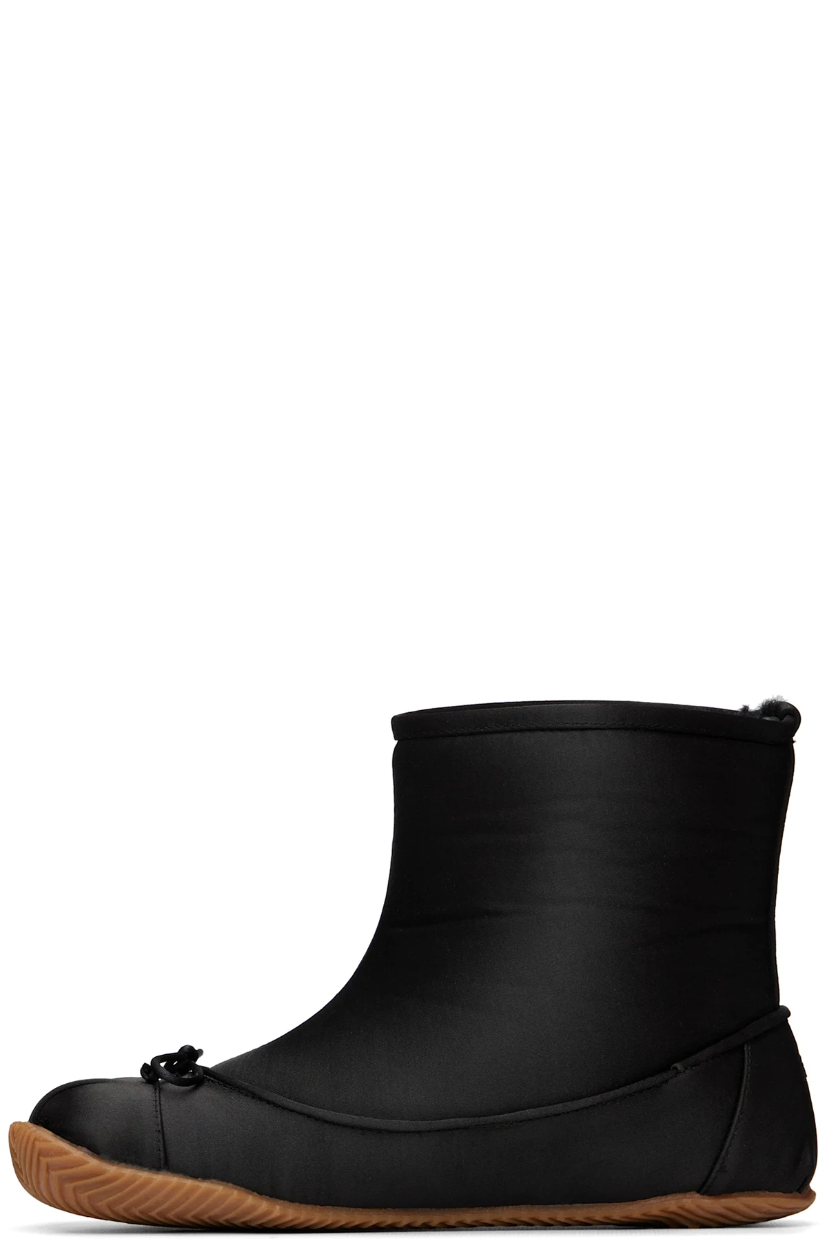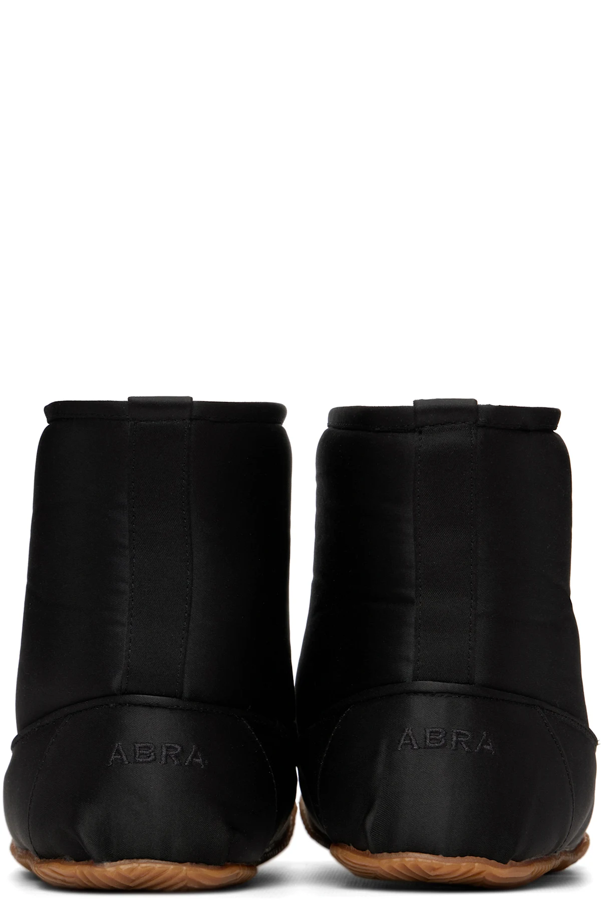 Ankle-high satin boots.