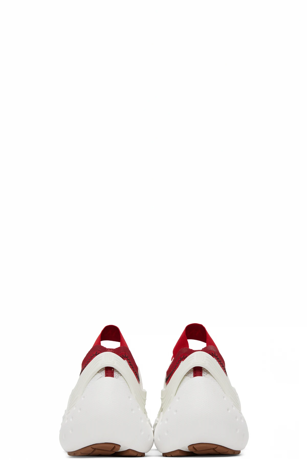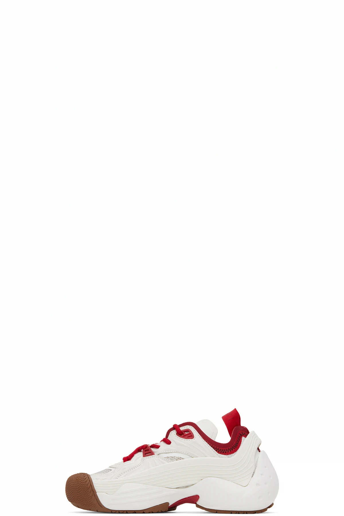 Low-top paneled TPU and mesh sneakers in red and white. Textured rubber trim throughout.