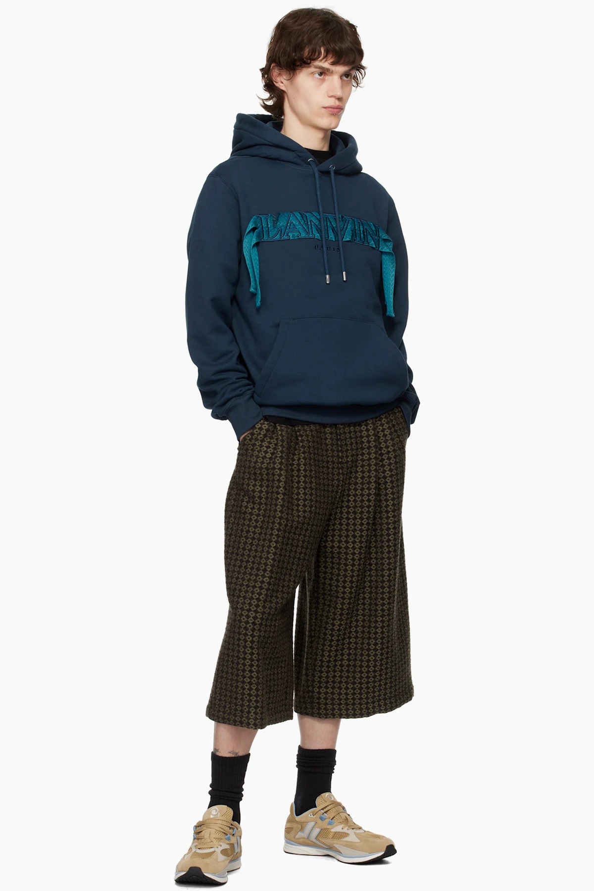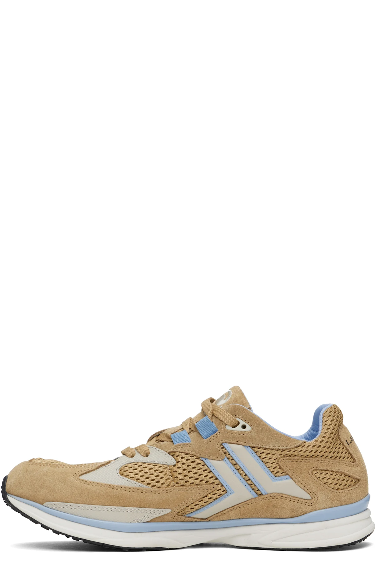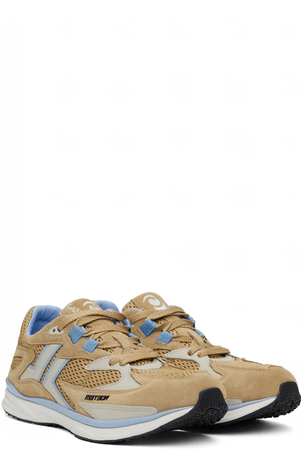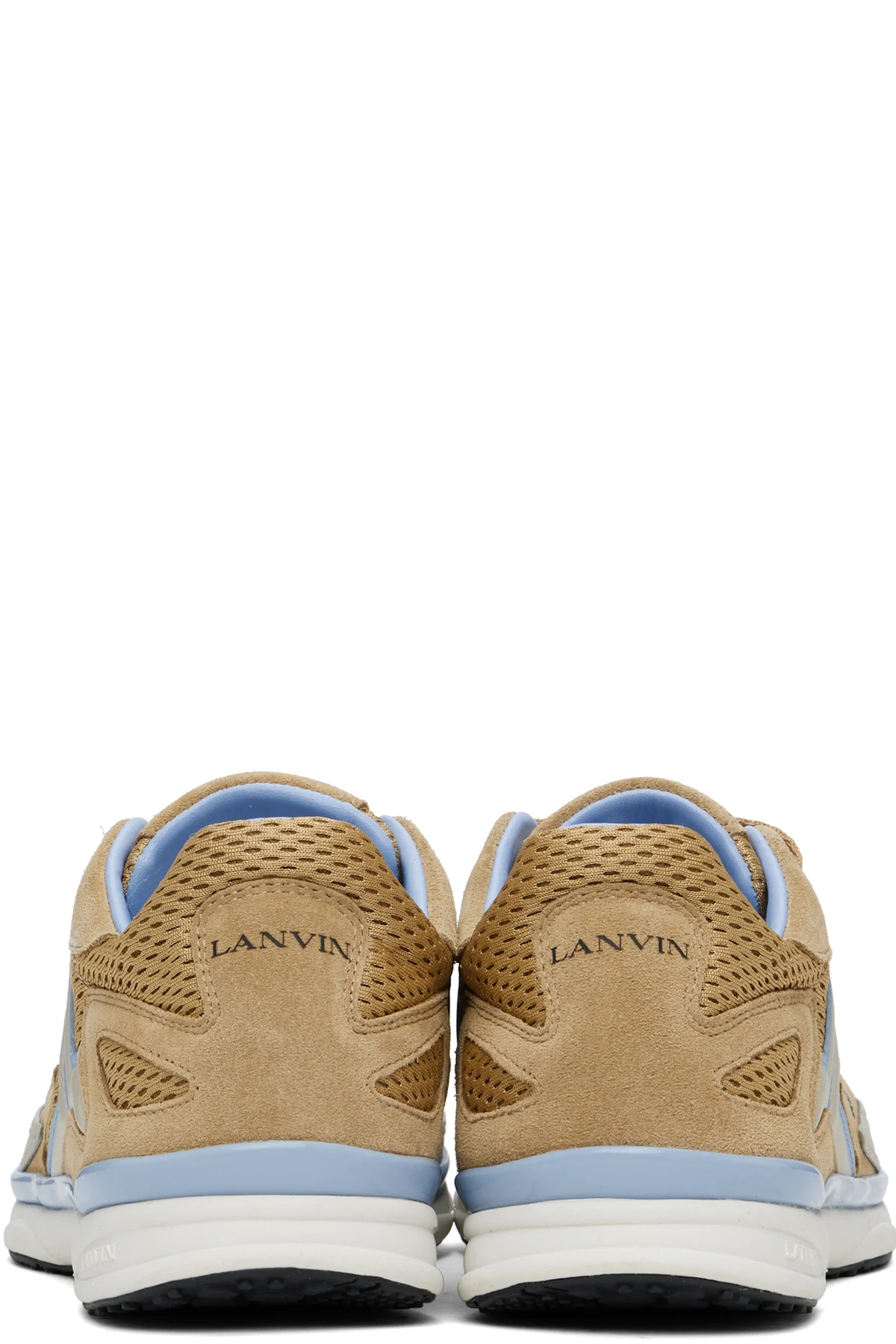 Low-top paneled goatskin suede, mesh, and bonded jersey sneakers in beige and blue.