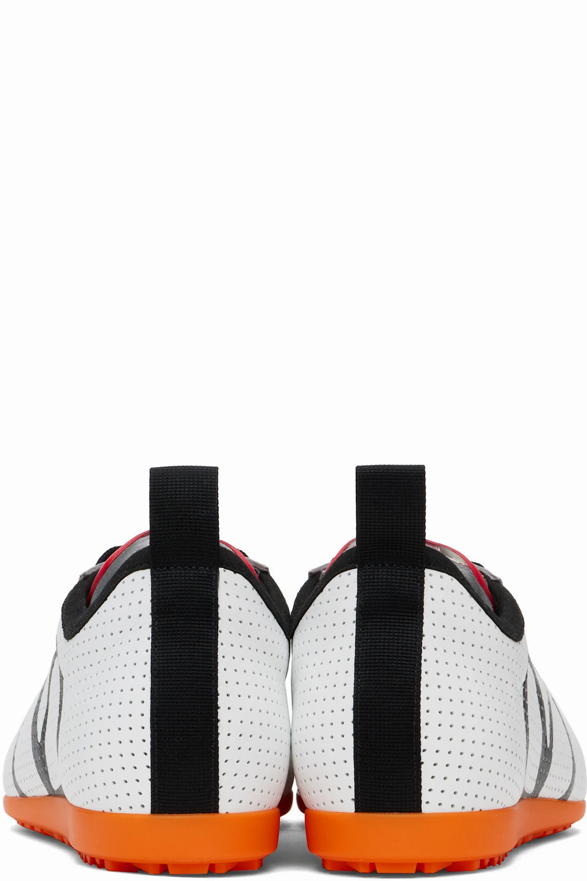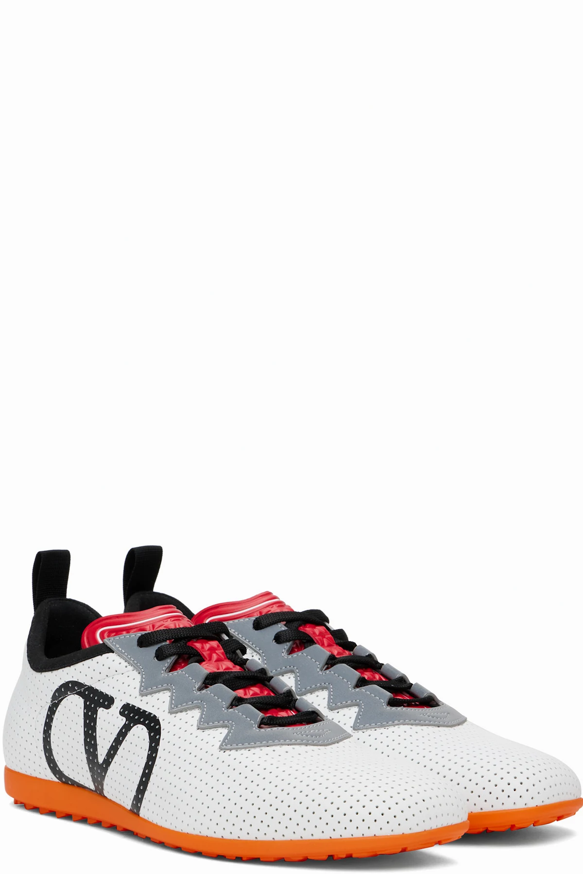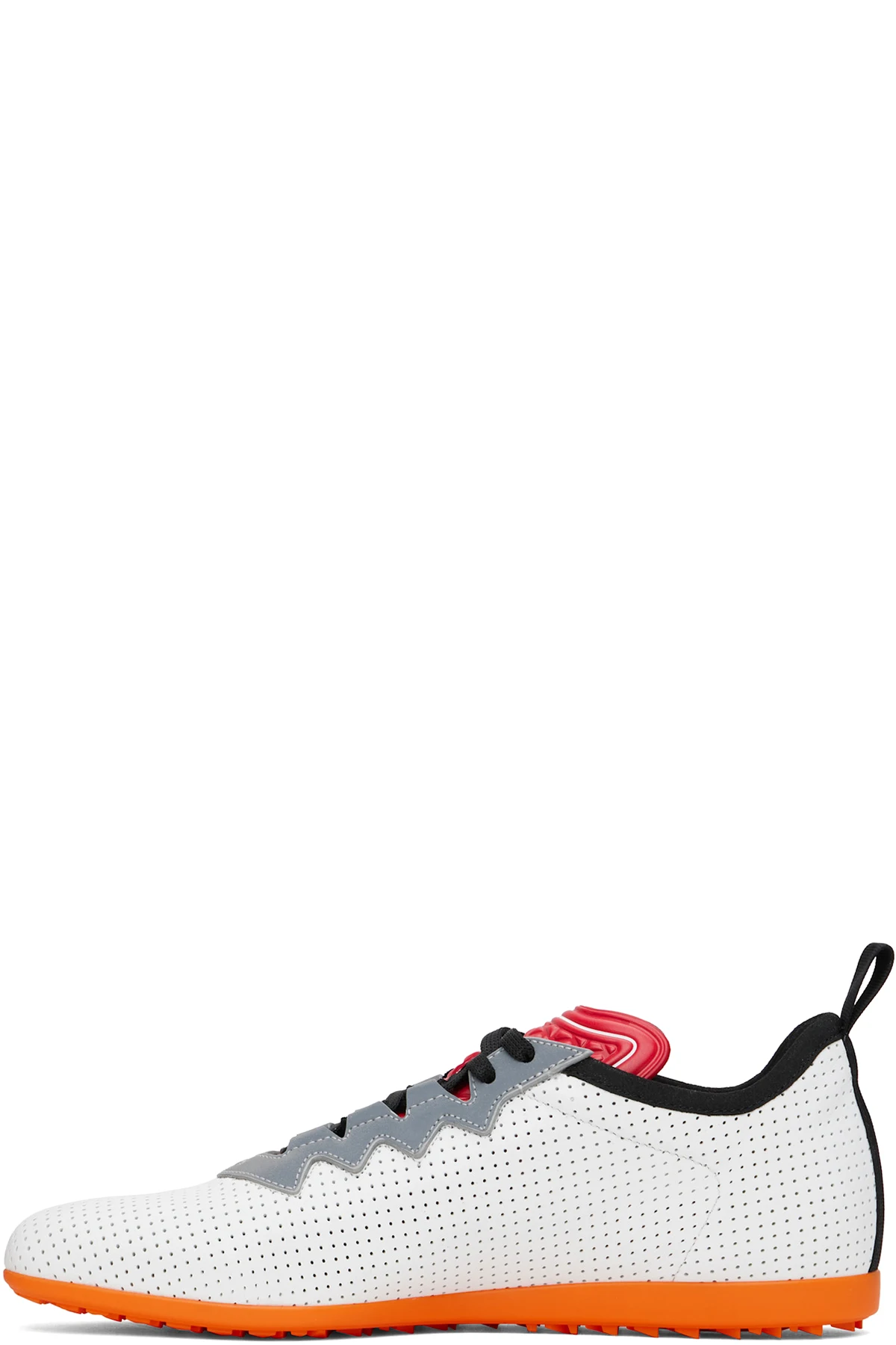 Low-top buffed leather sneakers in white, gray, and red.