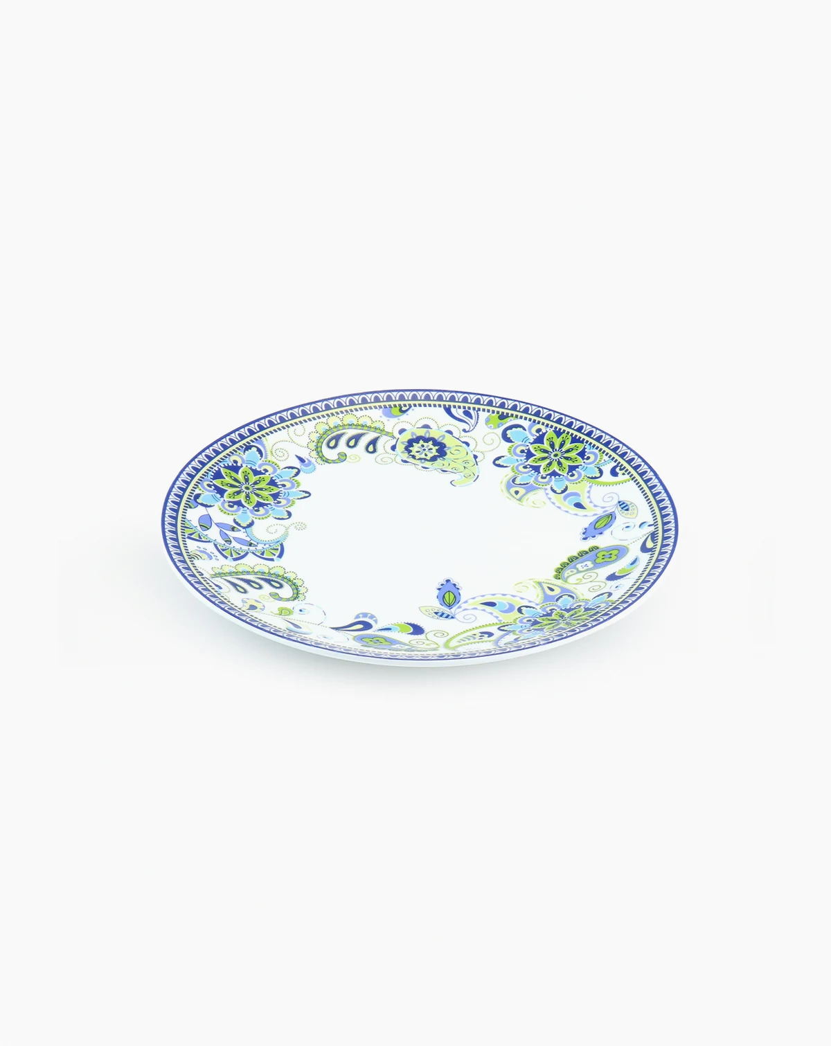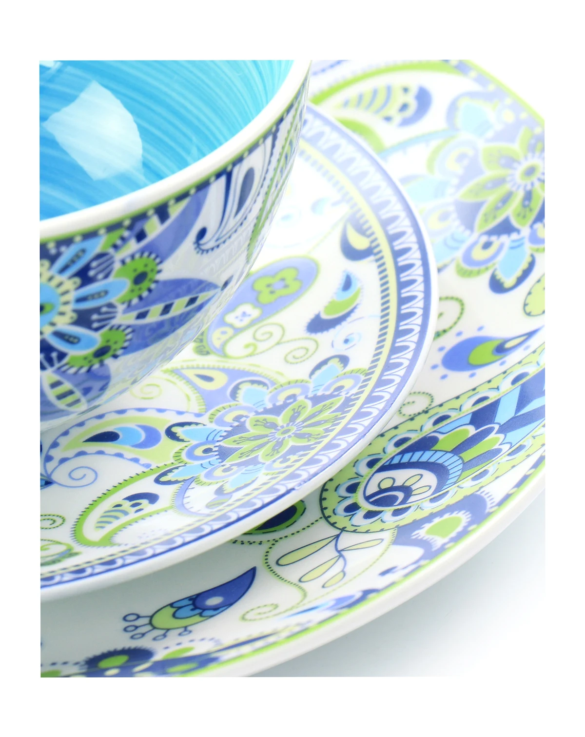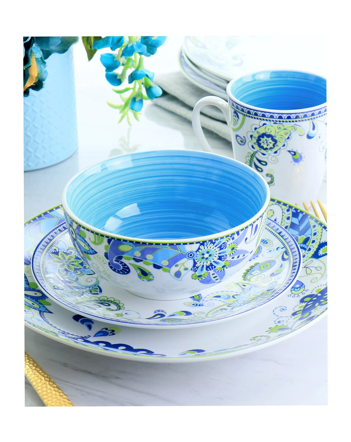 Add a beautiful accent to your dining table with the Elama 16 piece round porcelain dinnerware set in an arrangement of bright and beautiful blue and green mandala design.