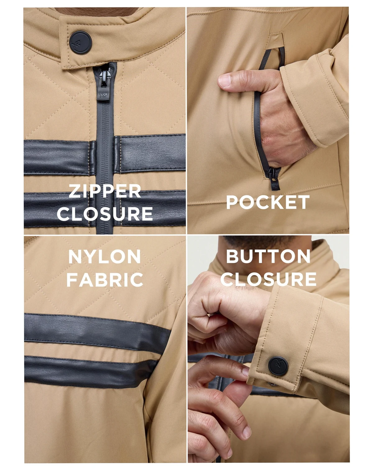 Shell 92% Polyester 8% Spandex, PU 100% Polyester, Lining 100% polyester, Padding 100% polyester; Nylon fabric.