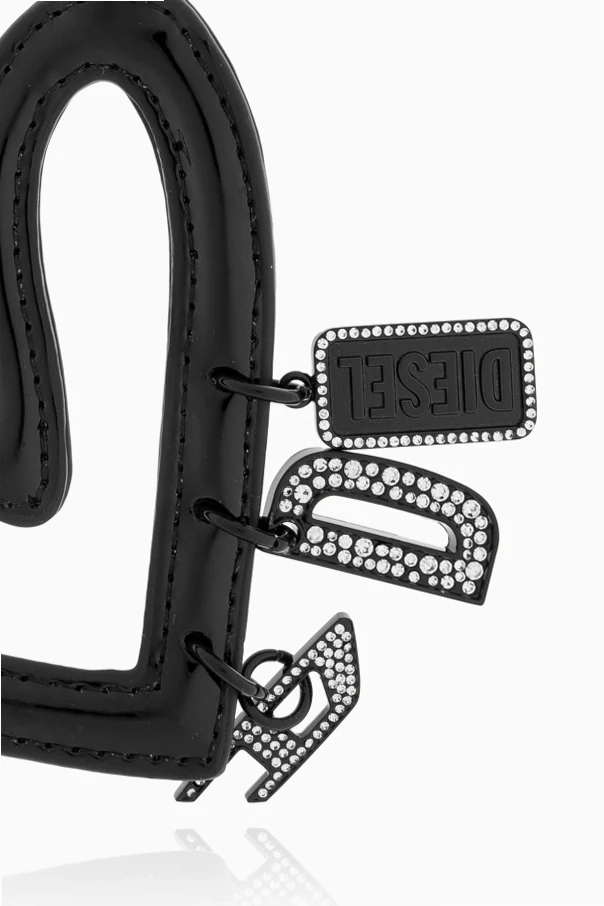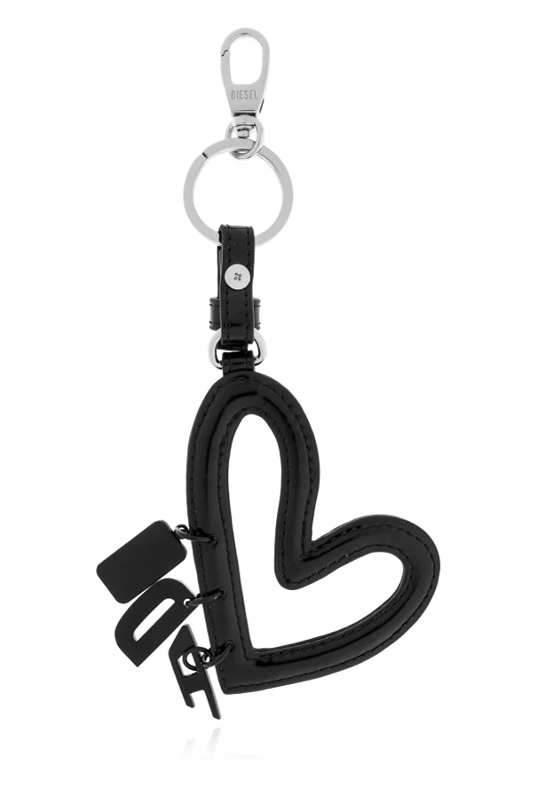 Distinctive details set this accessory apart: three shimmering metal charms—one rectangular plaque engraved with the Diesel name and two letters forming part of the signature logo—grace the heart, each adorned with sparkling, petite crystals for a touch of opulent sophistication. Sleek silver-toned hardware, including the clasp and key ring, are etched with subtle branding, exuding refinement and ensuring durability.