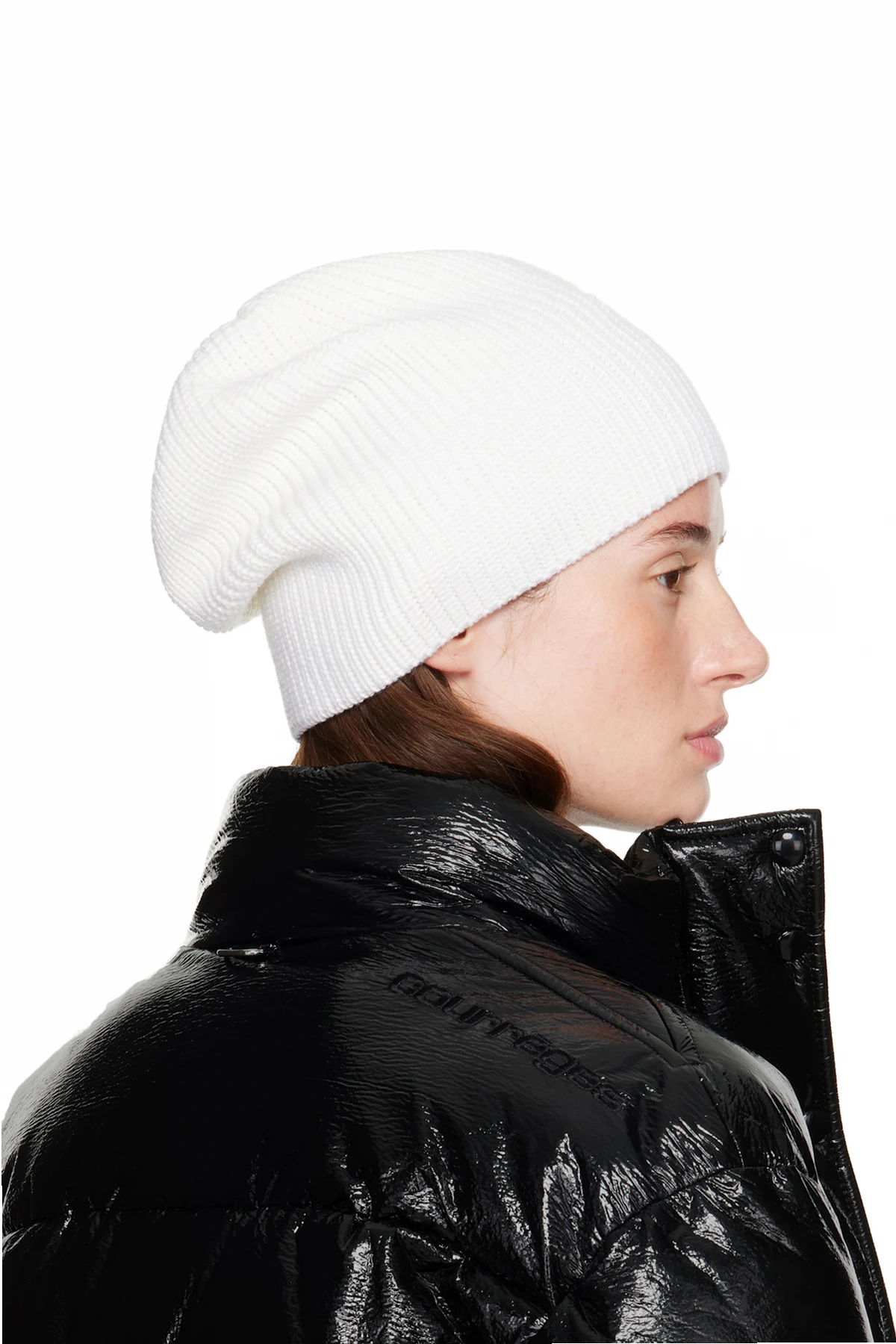 Rib-knit merino wool beanie. Embroidered logo patch at face.