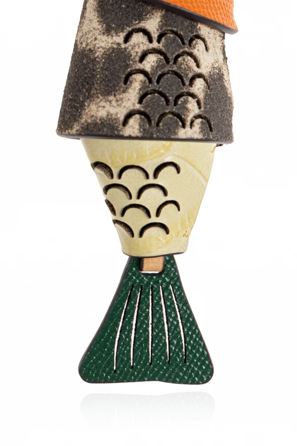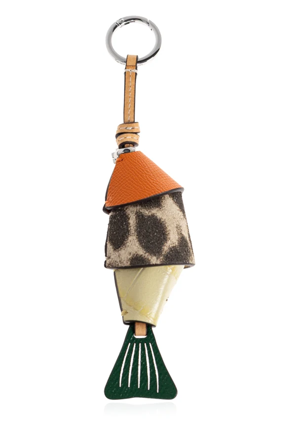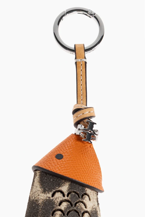 Experience a harmonious fusion of artistry and utility with this multicolor keychain by Tory Burch . Meticulously crafted in the form of a stylized fish, this accessory captivates with its segmented silhouette—each section thoughtfully distinguished by diverse hues and textures. Exquisite top-grain leather in rich orange forms the head, a beige and brown spotted torso echoes patchwork sophistication, while the delicately embossed beige and deep green tail complete its distinctive composition.