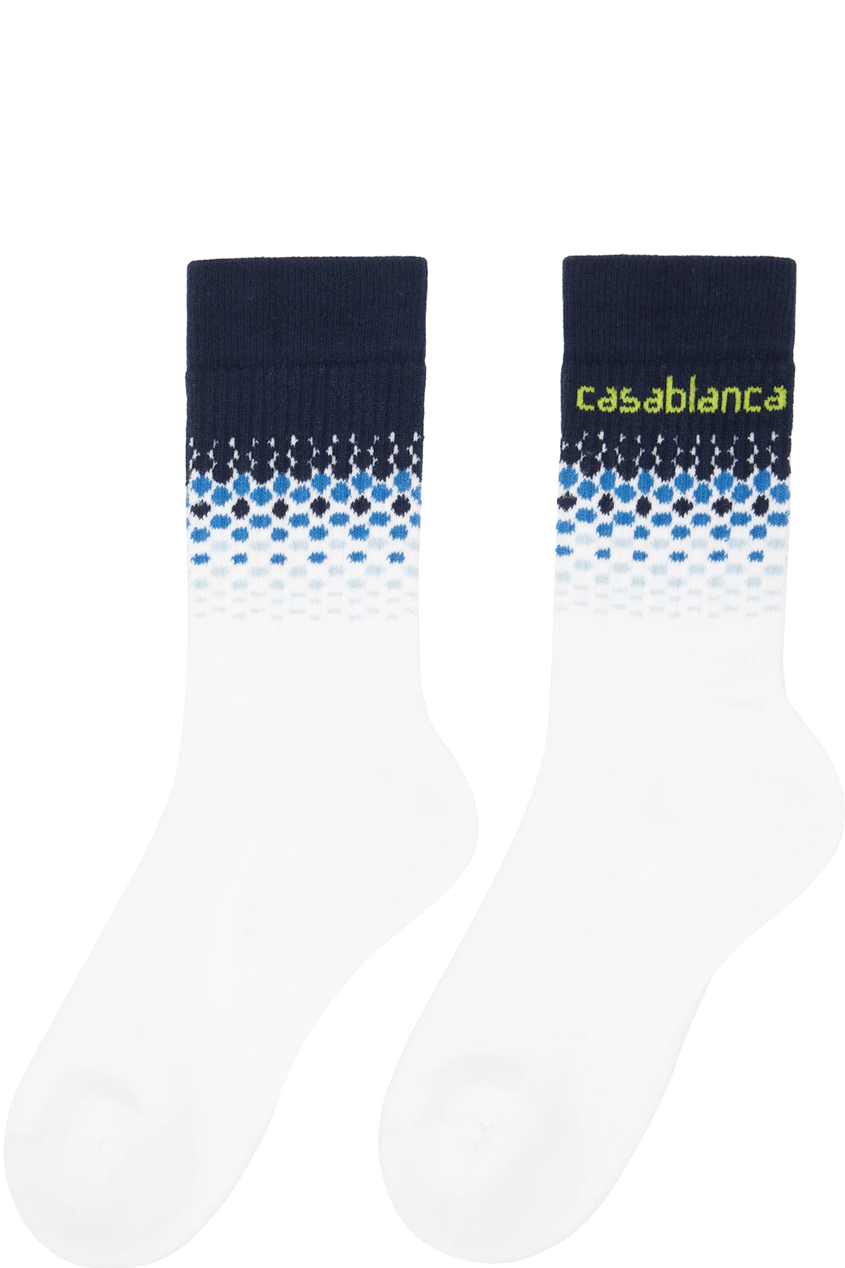 Pair of calf-high stretch recycled cotton-blend jersey socks. Jacquard pattern and logo at rib-knit collar.