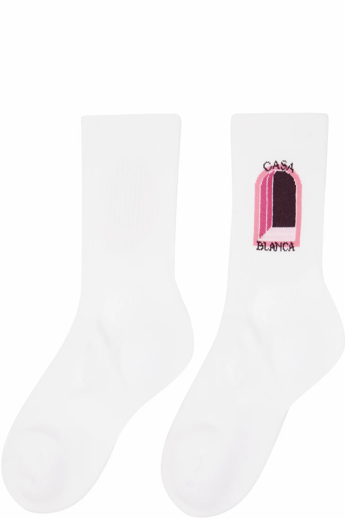 Pair of calf-high stretch recycled cotton-blend jersey socks. Jacquard logo graphic at rib-knit collar.
