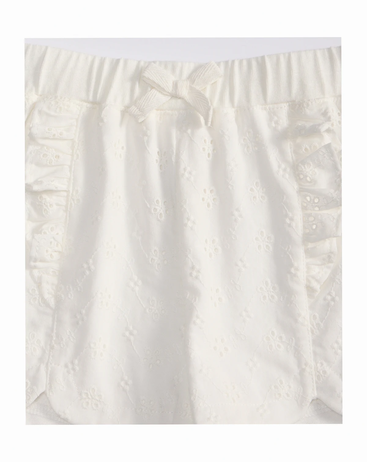Lovely eyelet and ruffled trim at the front add a sweet finish to these adorable cotton pull-on shorts from First Impressions.
