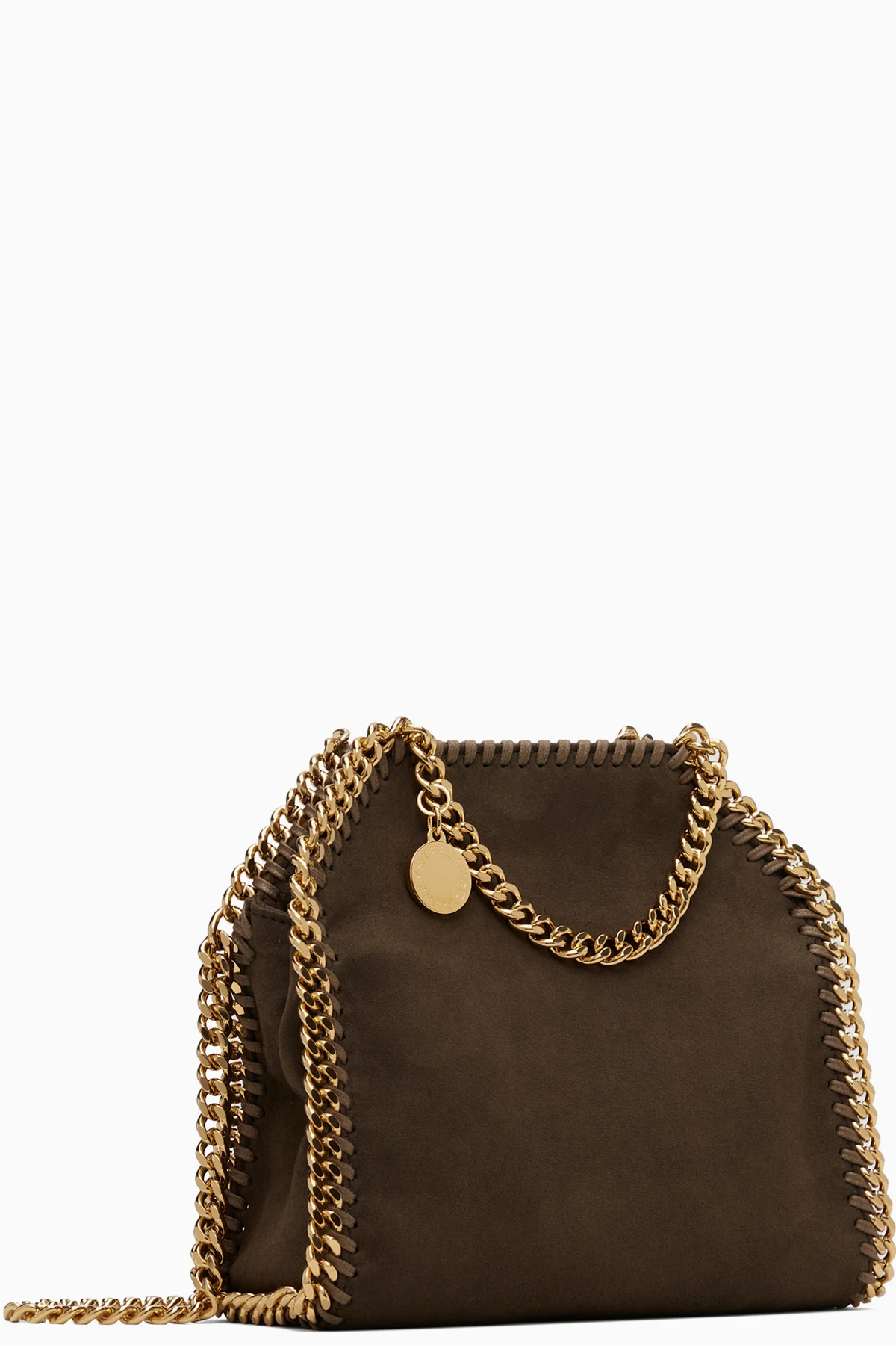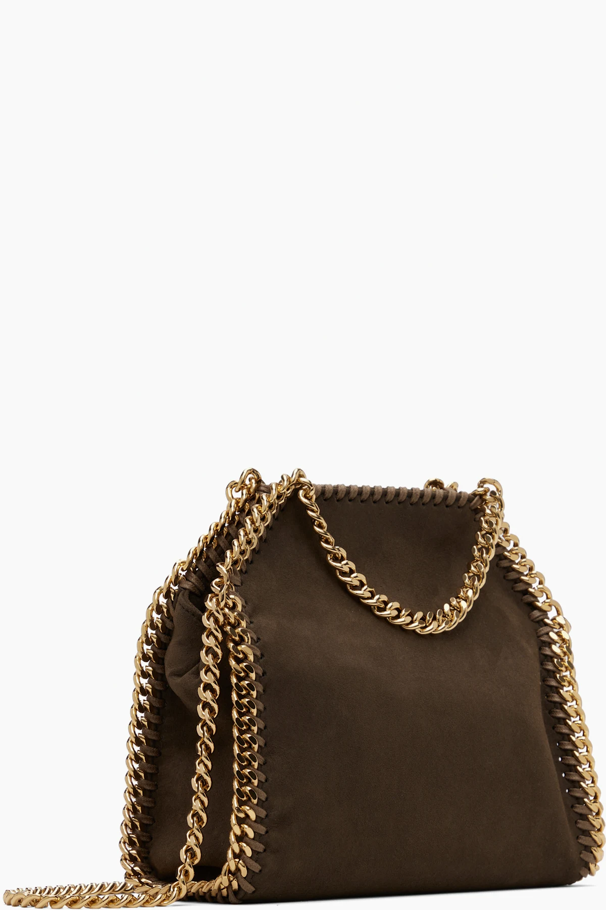 Handcrafted faux-suede shoulder bag. GOTS-certified organic cotton whipstitching and curb chain trim throughout.