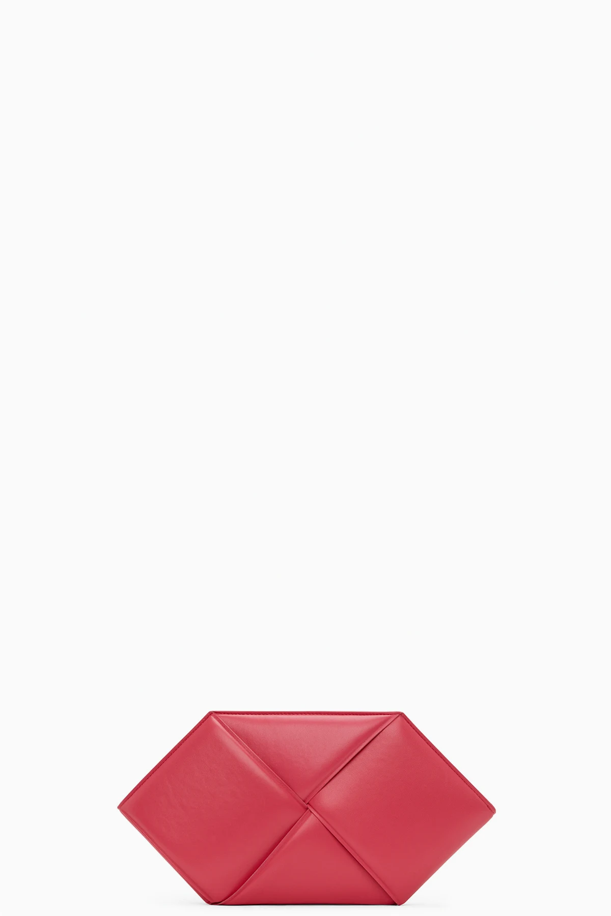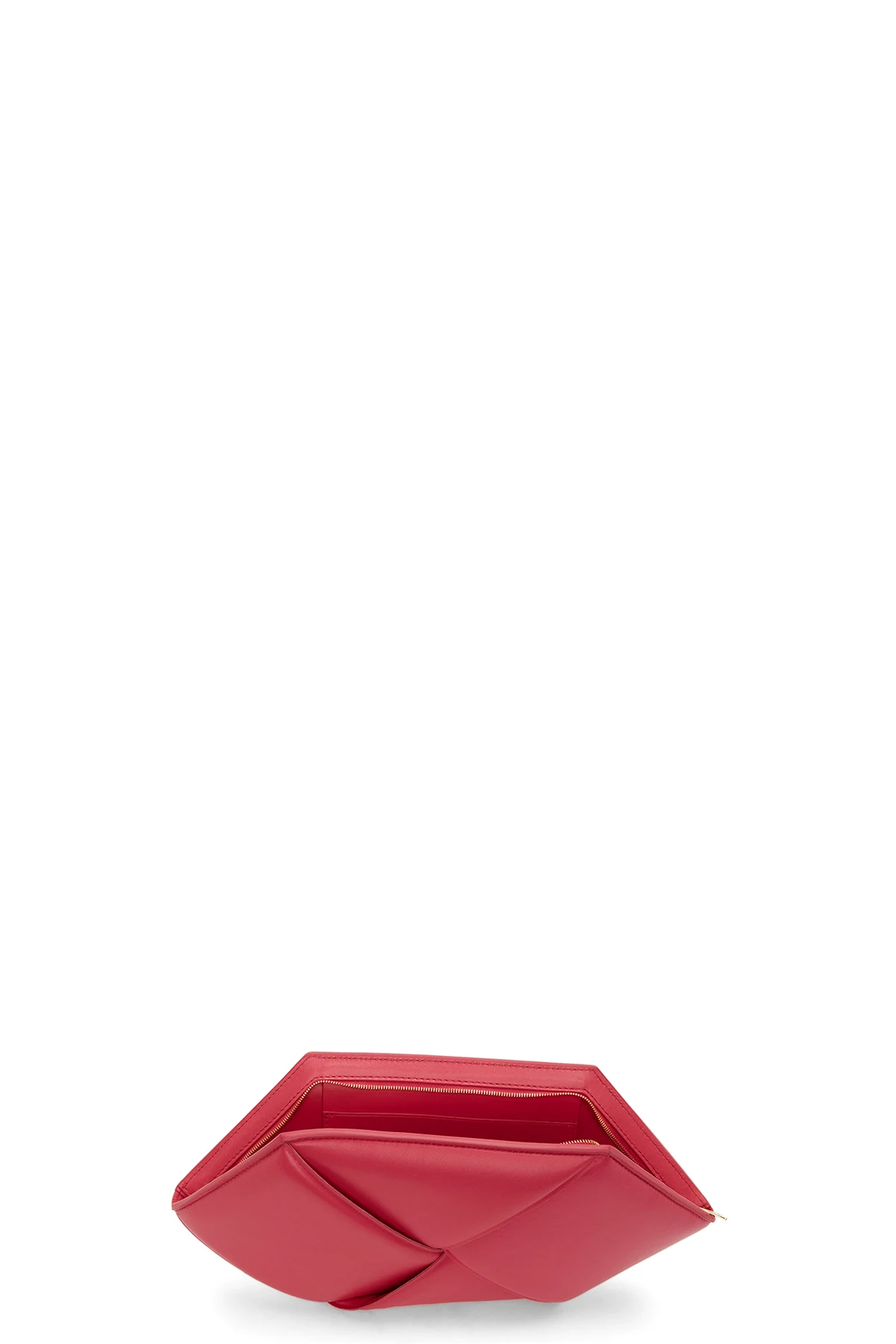 Hexagonal padded intrecciato-woven calfskin and lambskin pouch in pink. Zip closure. Buffed leather patch pocket with embossed logo at interior. Tonal leather lining. Gold-tone hardware. Approx. 14" length x 7" height x 2.5" width.