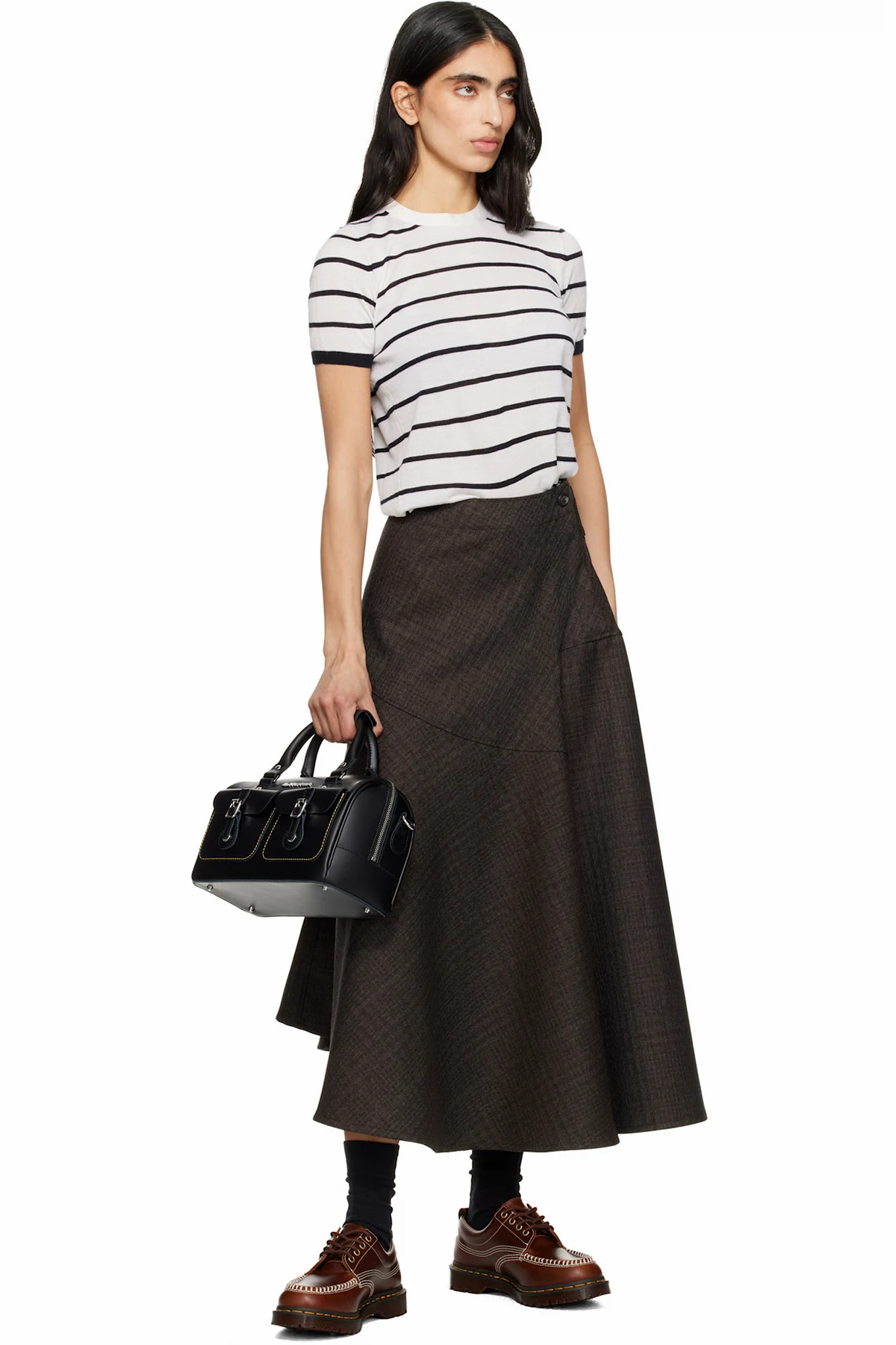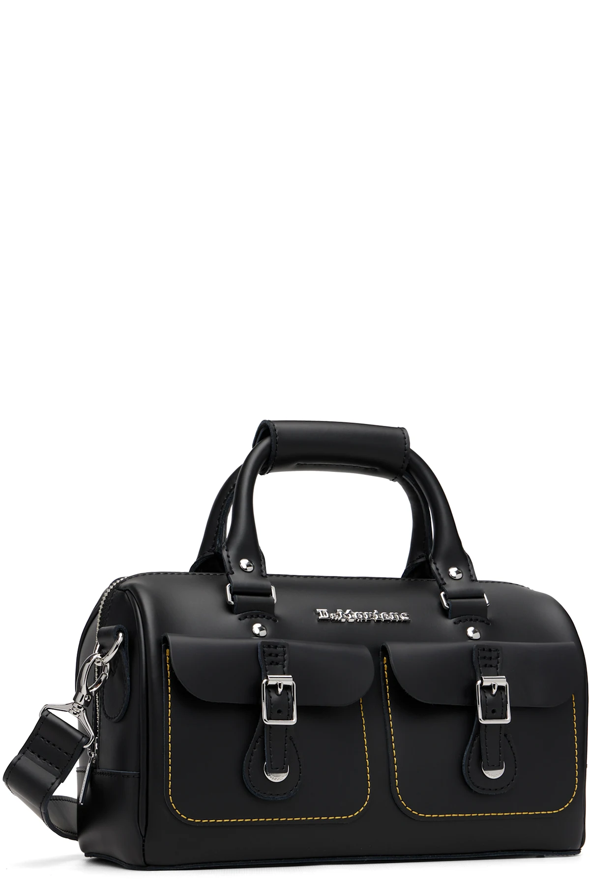 · Logo hardware and pin-buckle flap pockets at face