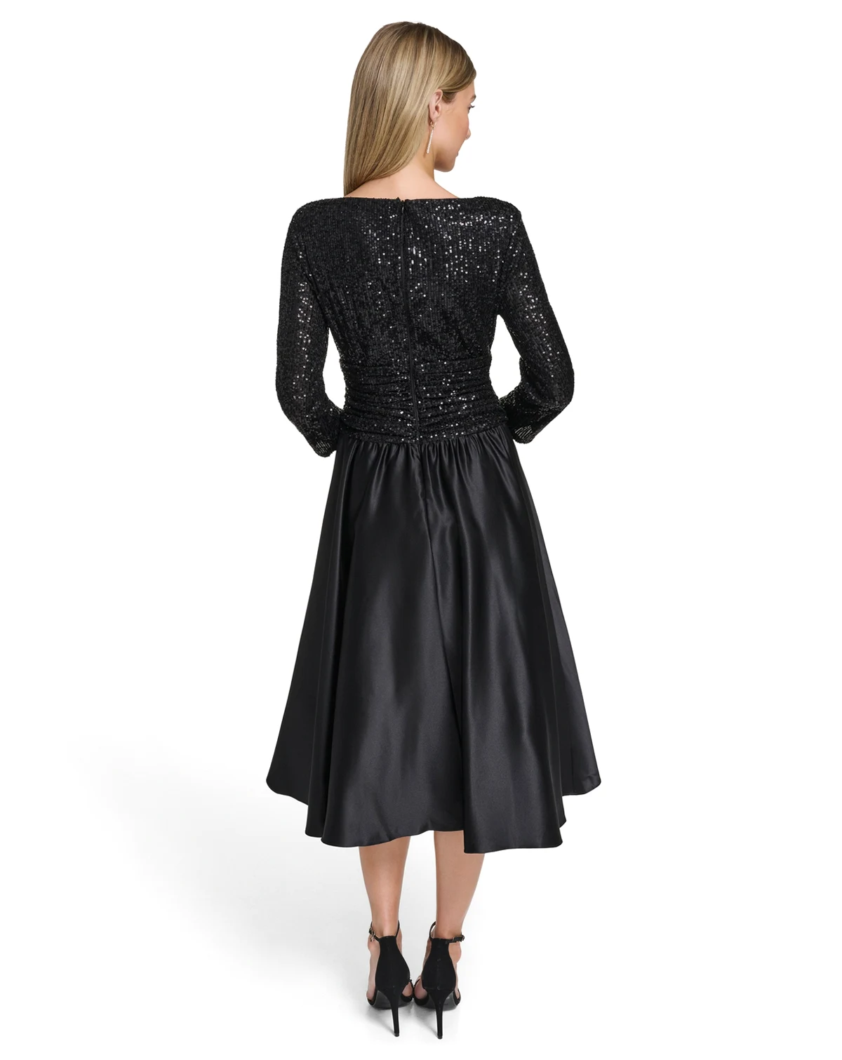 Make any evening a glamorous one with this sequined dress from Jessica Howard, featuring a V-neck and 3/4-sleeves. The ruched waist cinches beautifully to accentuate your figure, while the center-back zipper ensures a secure fit.
