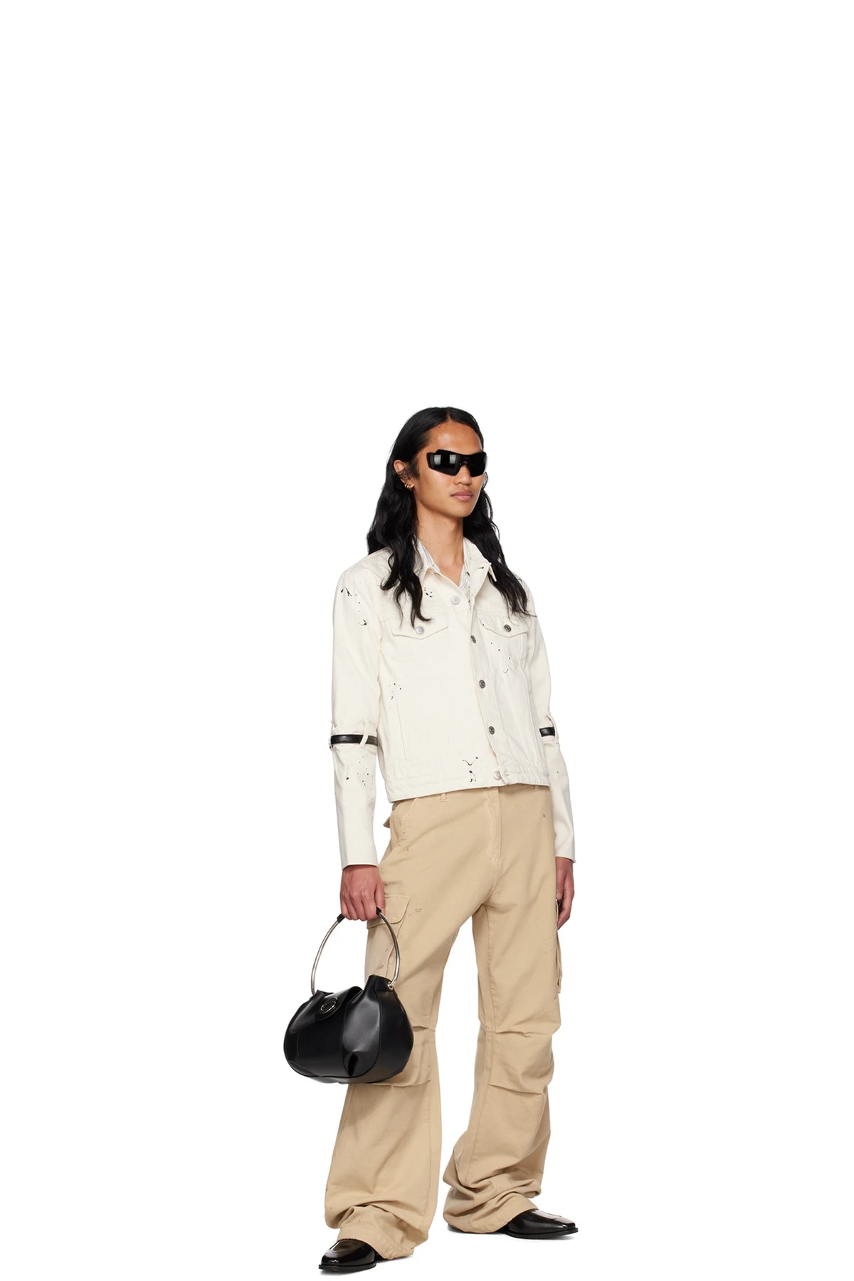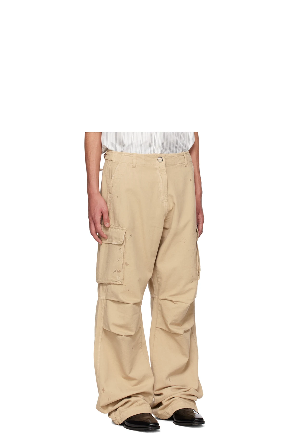 Wide-leg cotton canvas cargo pants. Smudging and distressing throughout.