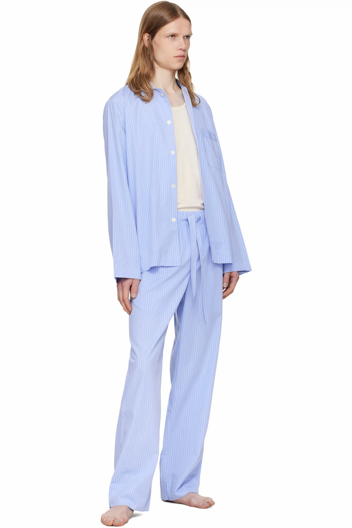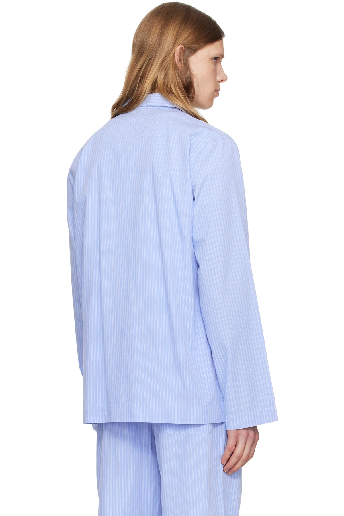 Stonewashed lightweight organic cotton poplin pyjama shirt. Pinstripes throughout.