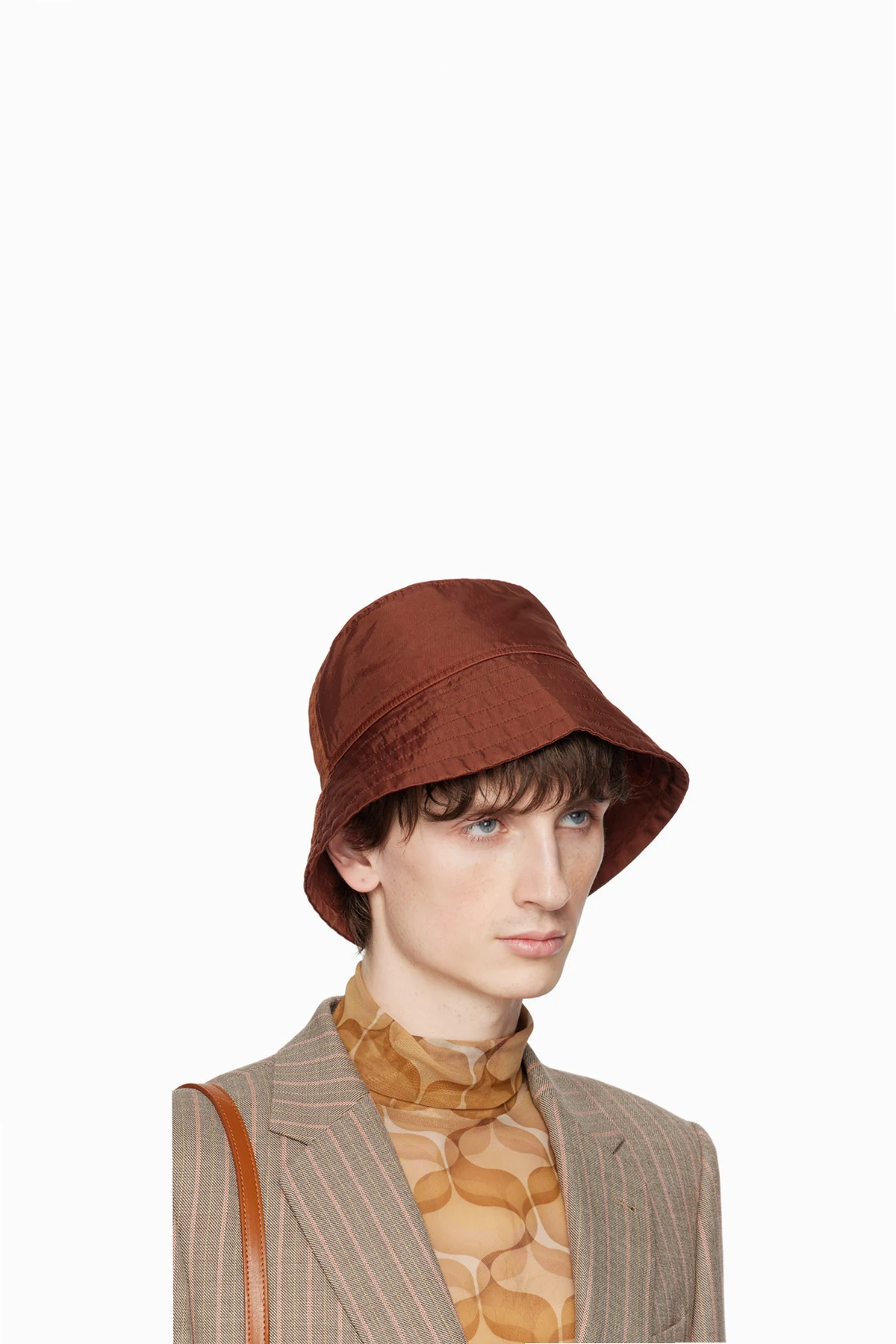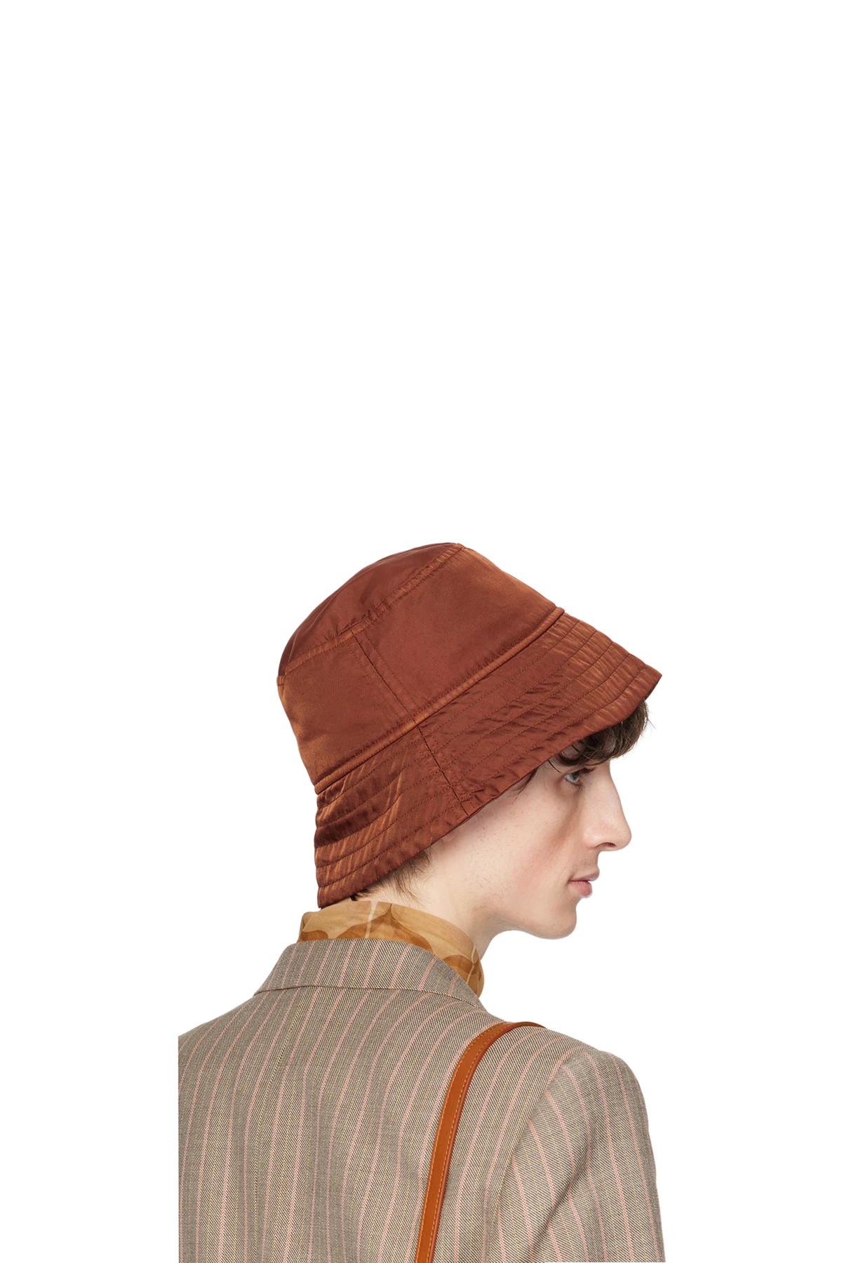 Paneled nylon twill bucket hat in orange.