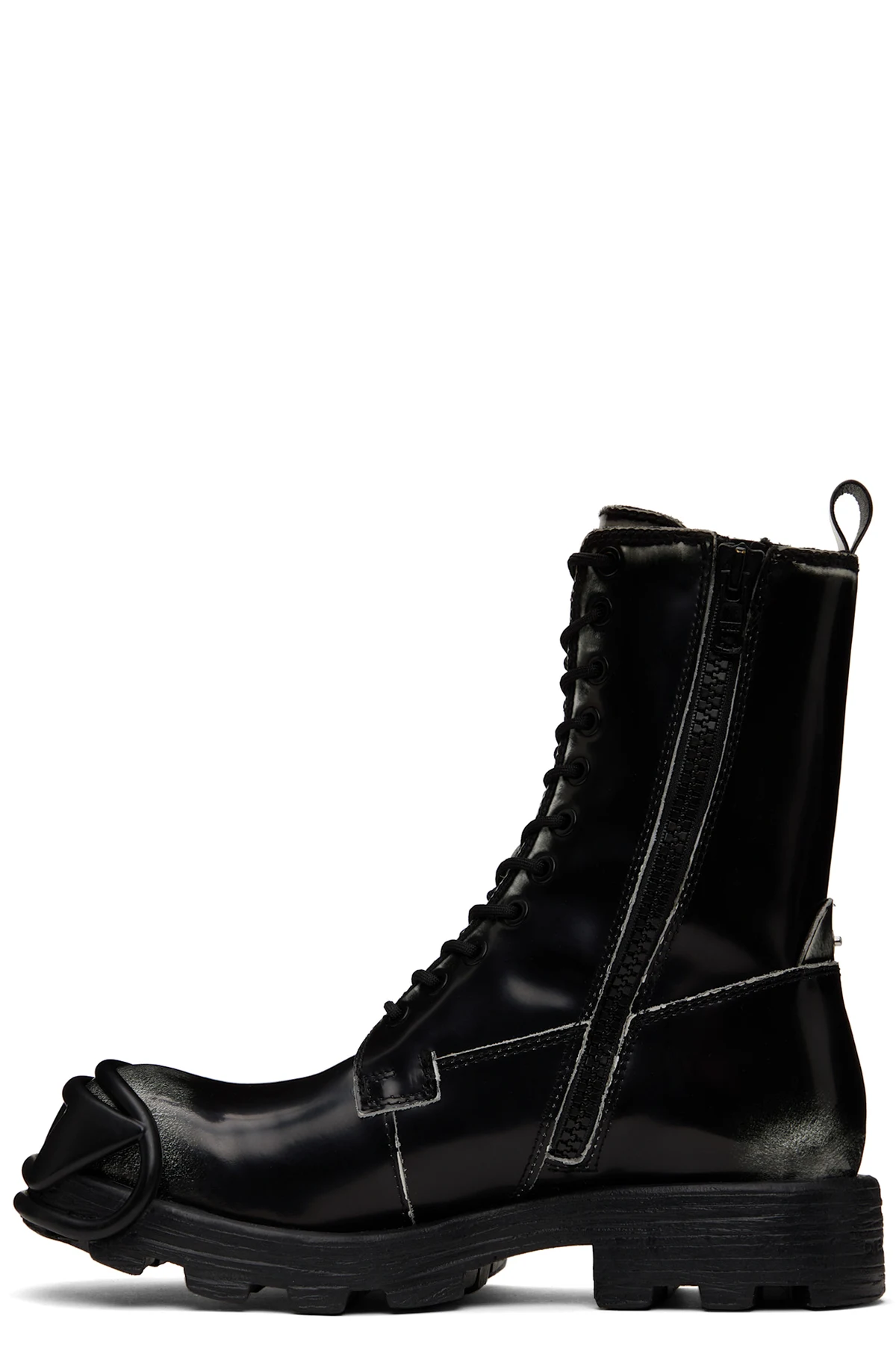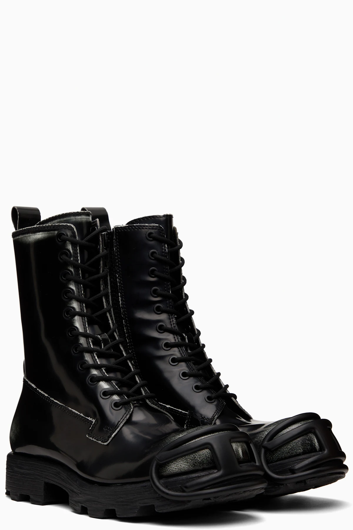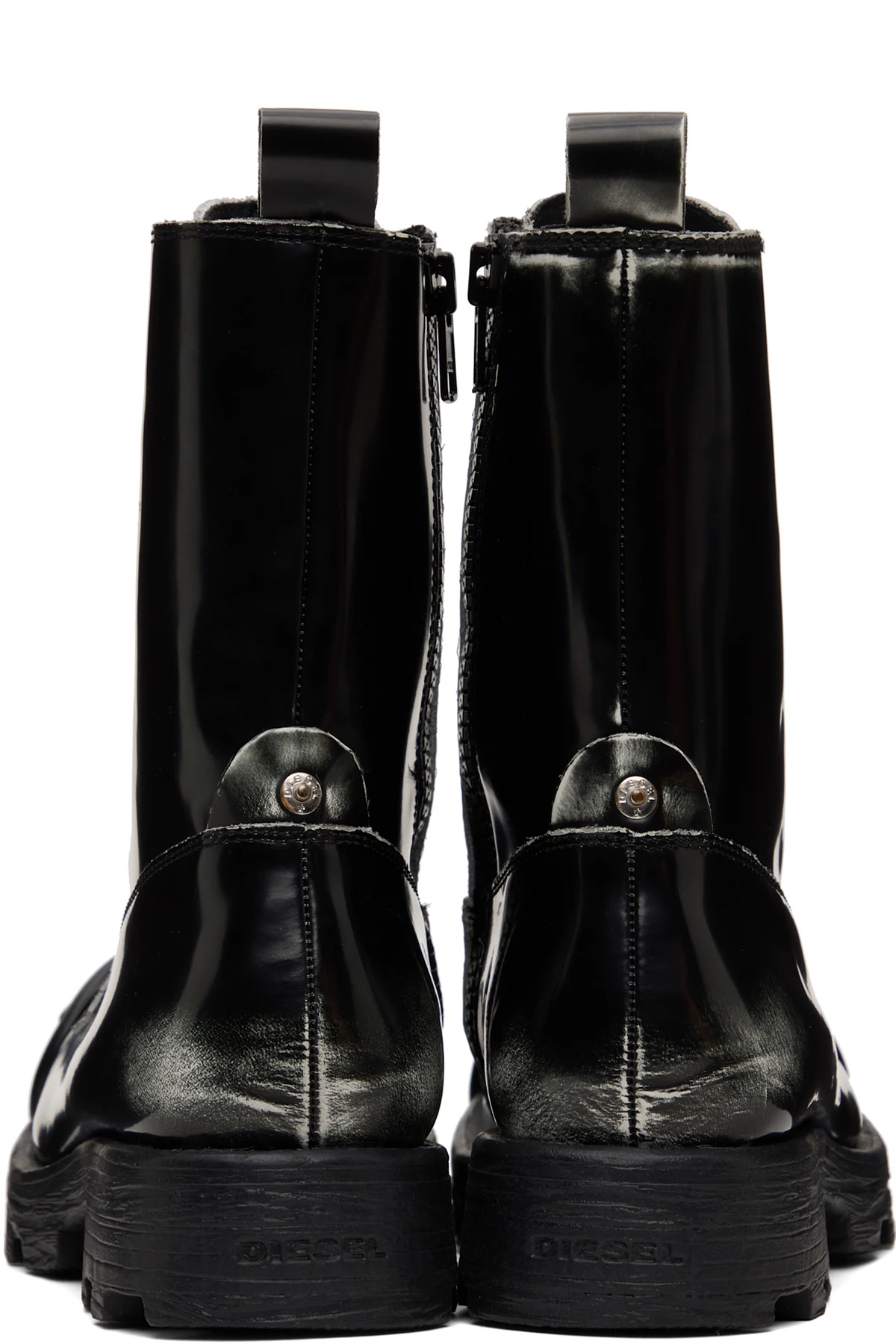 Ankle-high polished leather boots.