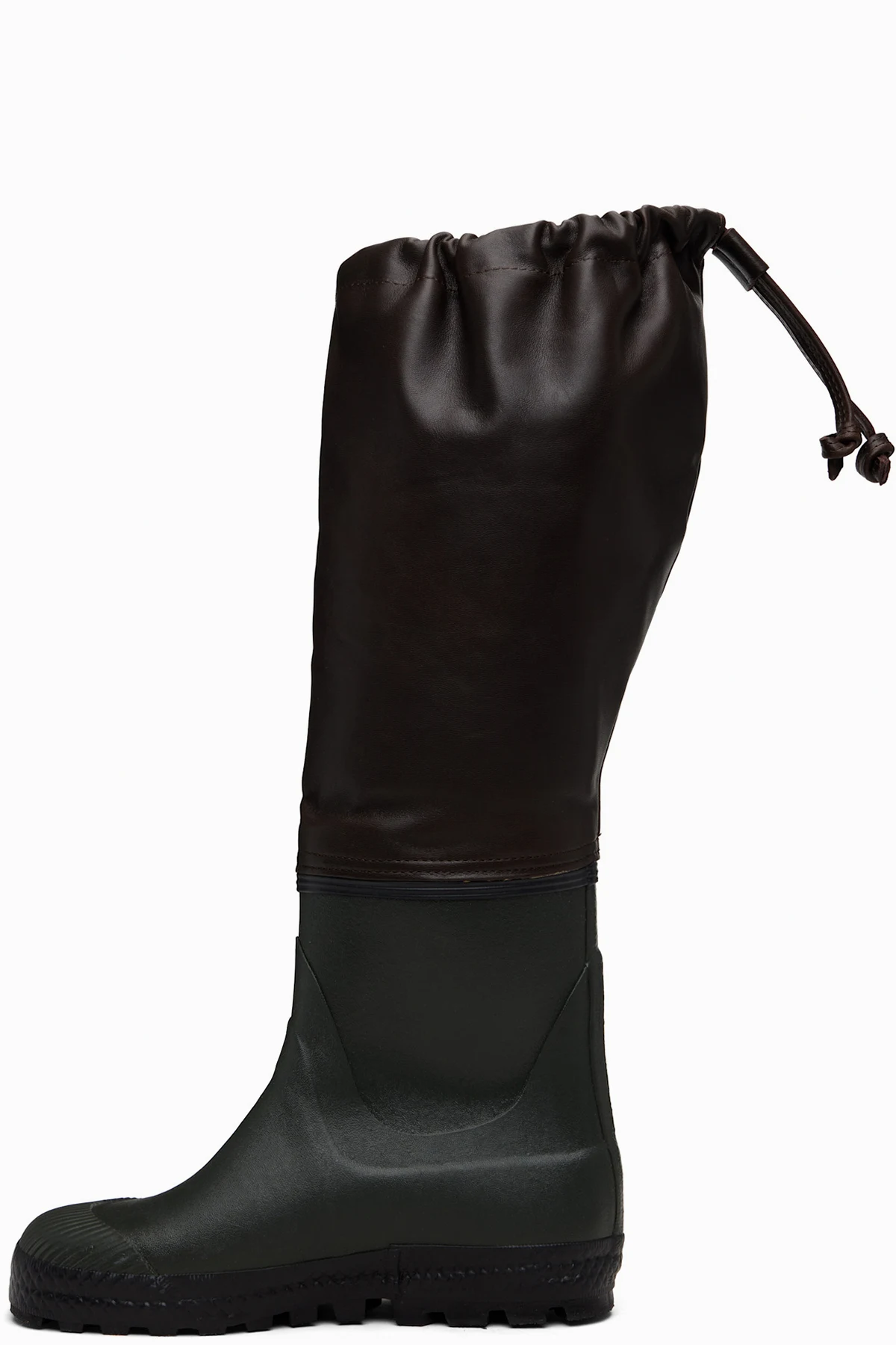 Knee-high paneled rubber and grained leather boots.