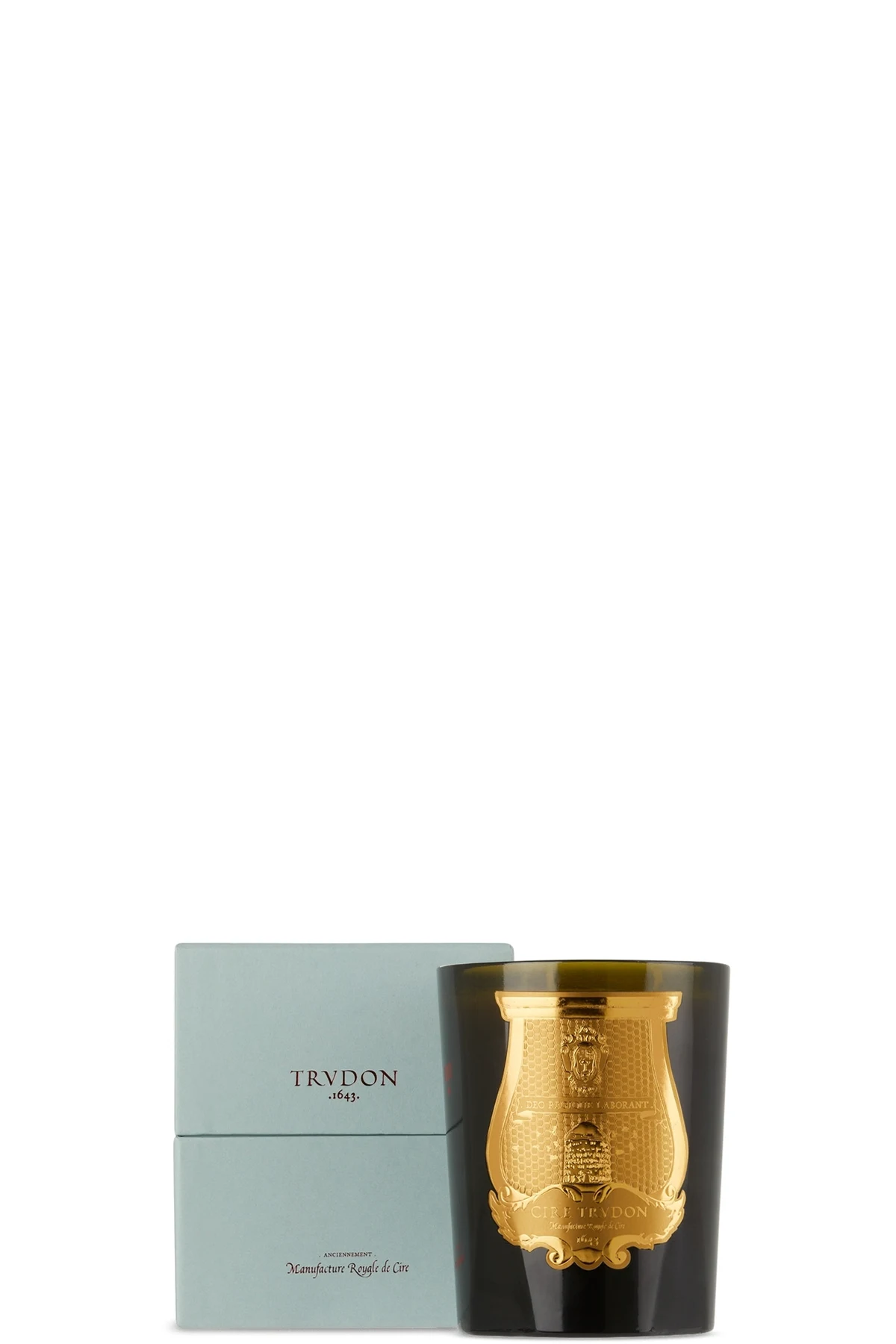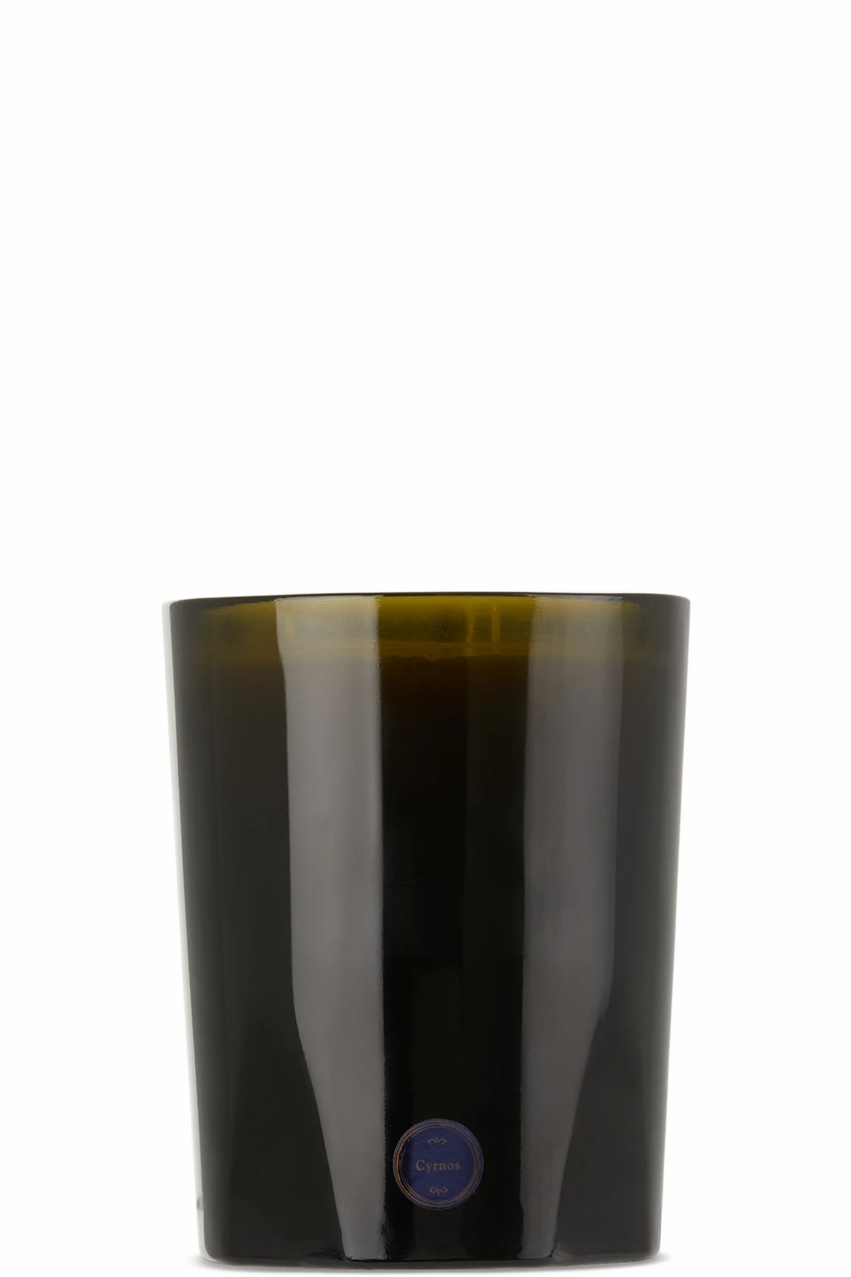 Hand-poured wax candle in Cyrnos. Fragrances feature fig, lemon, and thyme. Glass vessel in green.